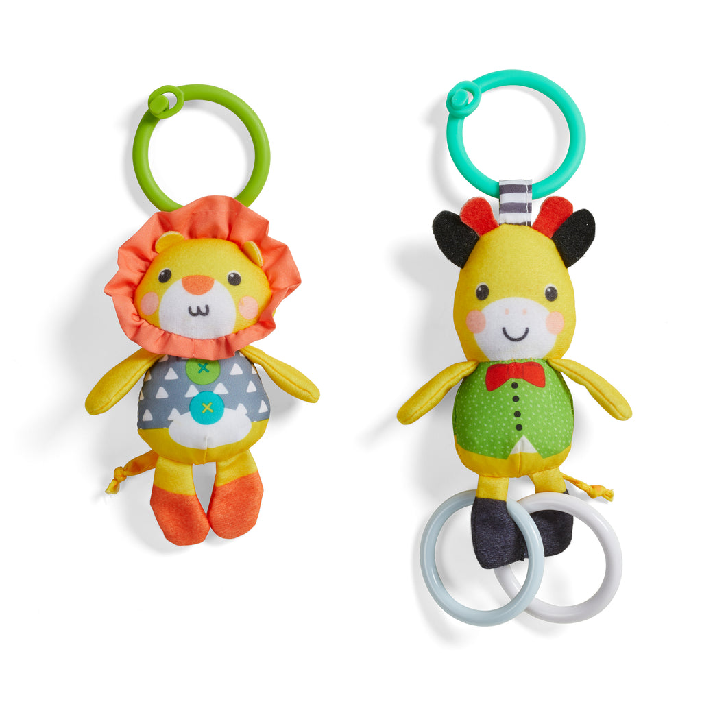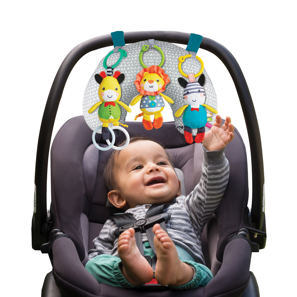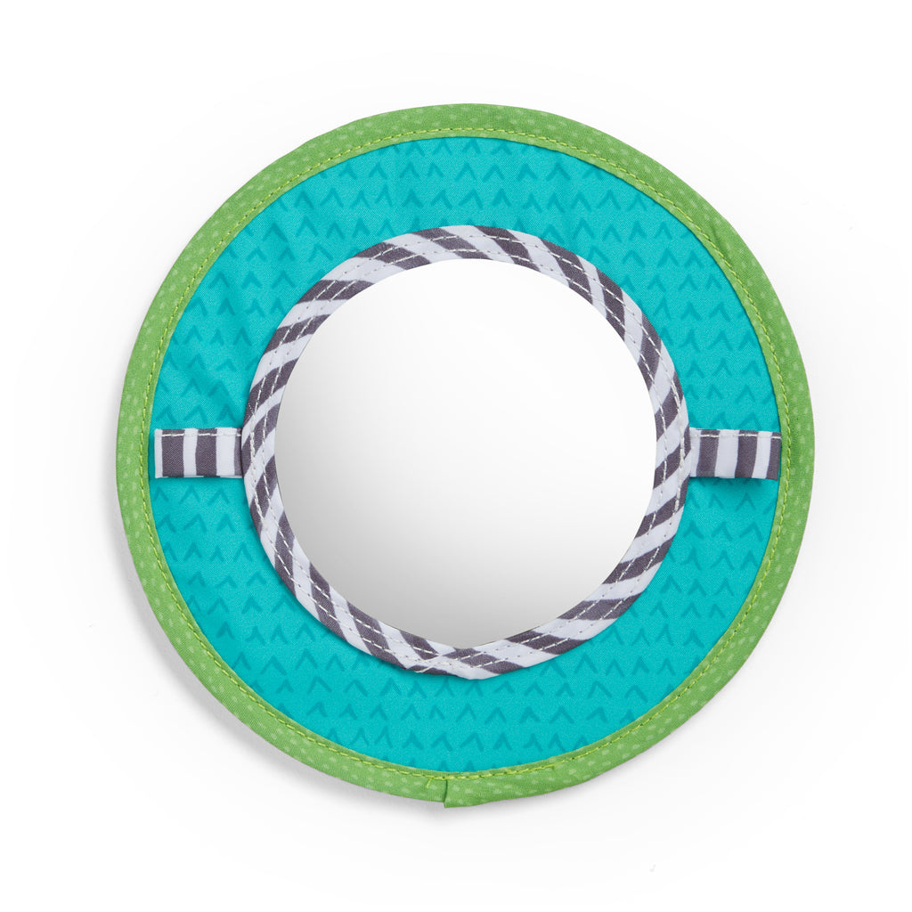- Includes four linkable, on-the-go sensory toys, mirror and bolster pillow