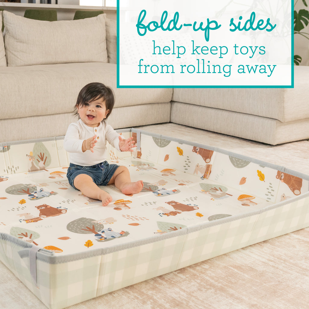 - Fold-up sides create a cozy play area and help keep toys contained