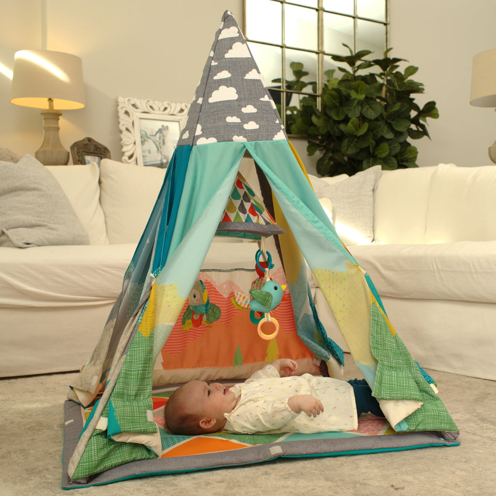 Babies will go gaga for this multi-functional gym that grows with your little one, transforming from an infant gym to a pretend play teepee. Four hanging toys and a large-mirrored mobile engage infants with overhead discovery. Squeeze the musical owl to delight little ones with a cheerful tune. As baby begins to crawl, close one side of the gym to create a crawl tunnel. For toddlers, unfold the gym's sides to create a fun, playtime teepee.