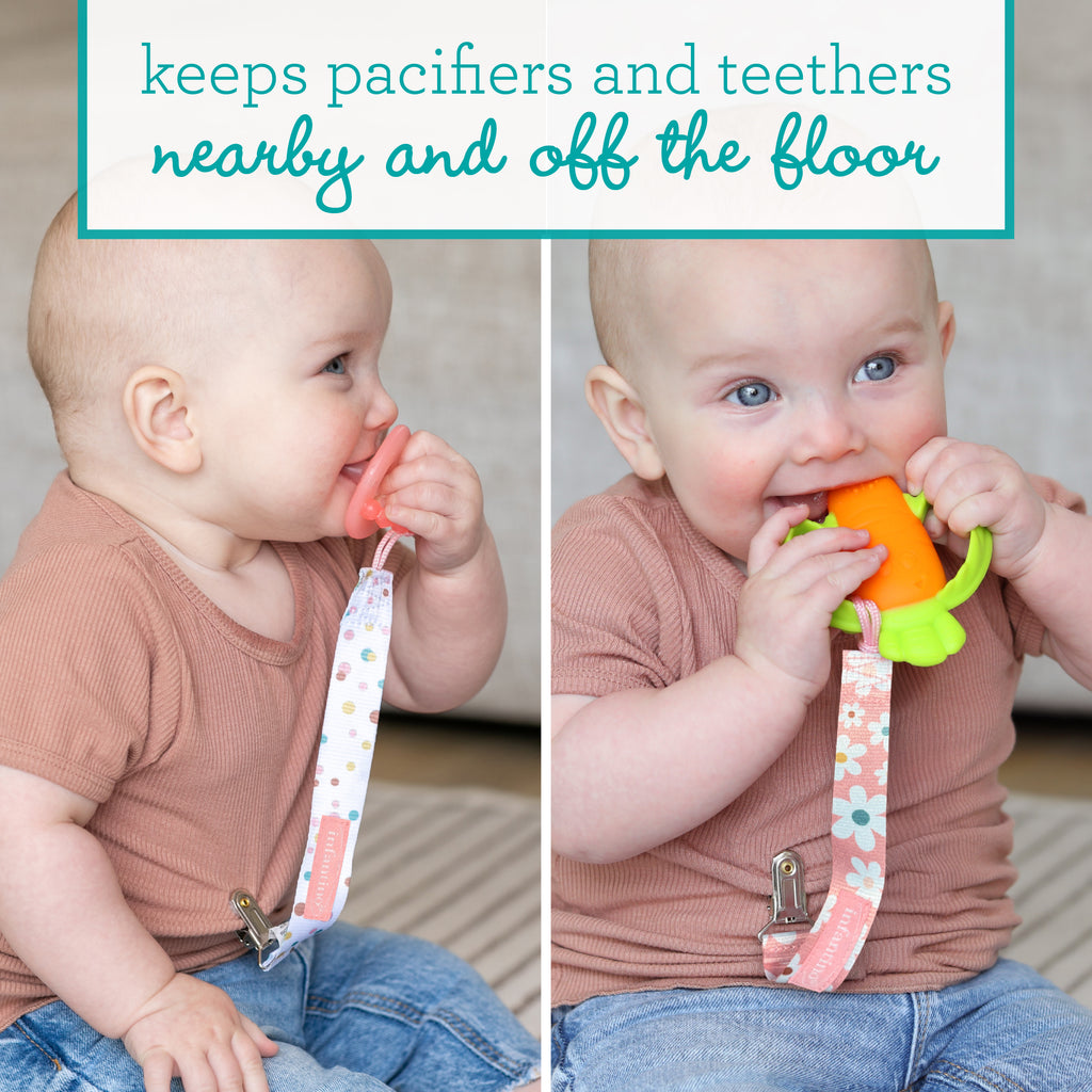 • Keeps pacifiers nearby and off the floor
