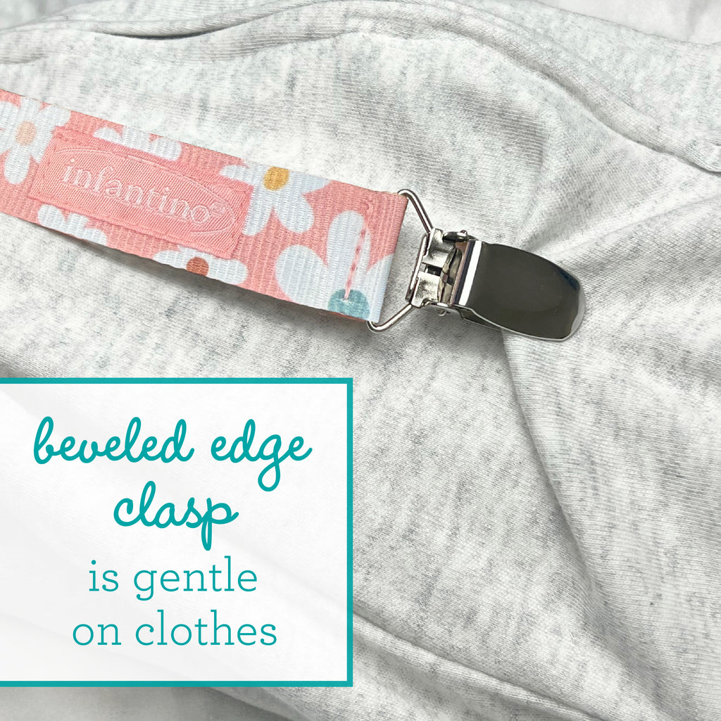 The Infantino PaciGrip is a must-have accessory for keeping pacifiers within reach. Designed for babies aged 0-36 months, this 2-pack of pacifier clips guarantees that your little one's pacifier remains secure and off the floor. The universal loop of the PaciGrip easily attaches to most pacifiers, offering convenience for busy parents. Its beveled edge clasp is designed to be gentle on clothing, preventing any damage or discomfort. Furthermore, the PaciGrip is easy to hand wash and dry flat, making it both practical and essential for everyday use. With its thoughtful design, the PaciGrip is an invaluable accessory that pairs with most pacifiers.