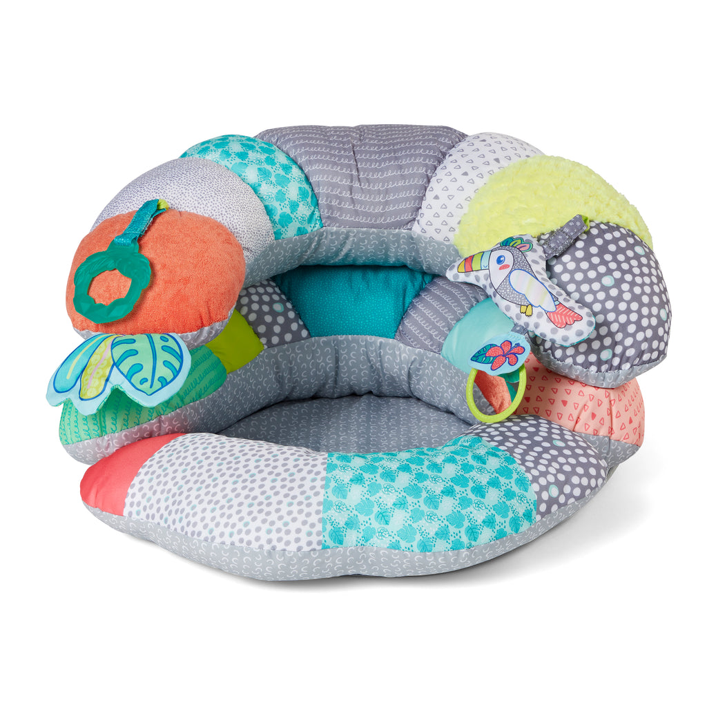 2-in-1 Tummy Time & Seated Support can be used as a playful tummy time prop or stacked up as a hugging positioner for beginning sitters. Includes 2 detachable and repositionable toys, a crinkly tucan and a BPA-free textured teether.