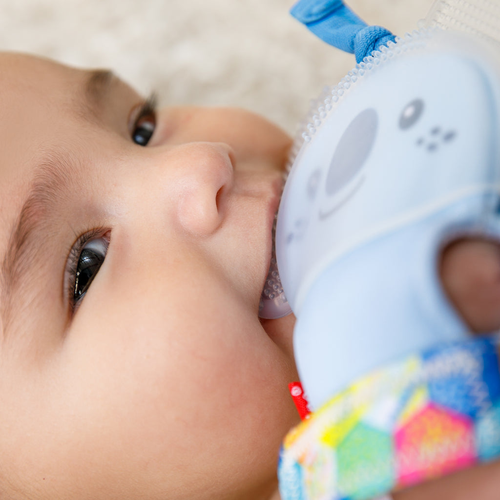 Babies and parents alike will love this convenient teething mitten. Slip this soft muslin and 100% clear silicone mitten over babies hand to keep teething worry free.