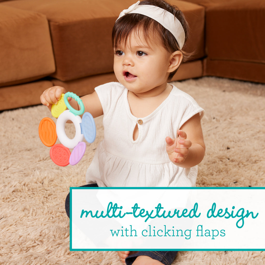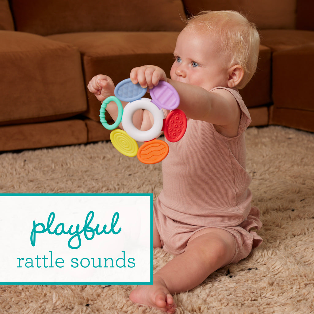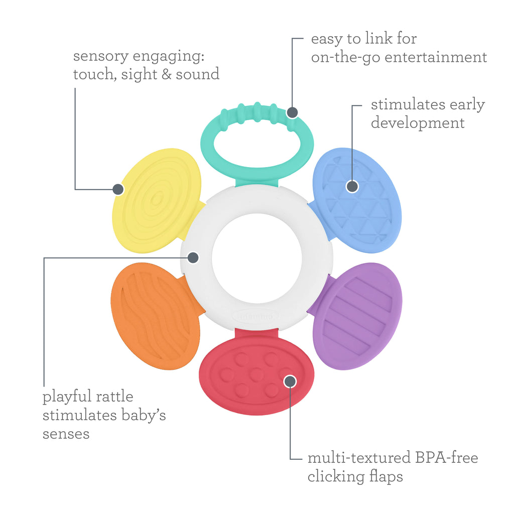 - The colorful, BPA-free multi-textured rattle with twist and click flaps stimulates the brain and supports early fine motor and cognitive skills