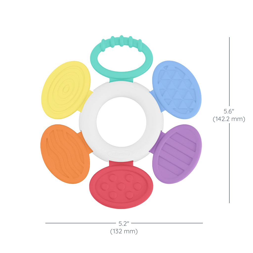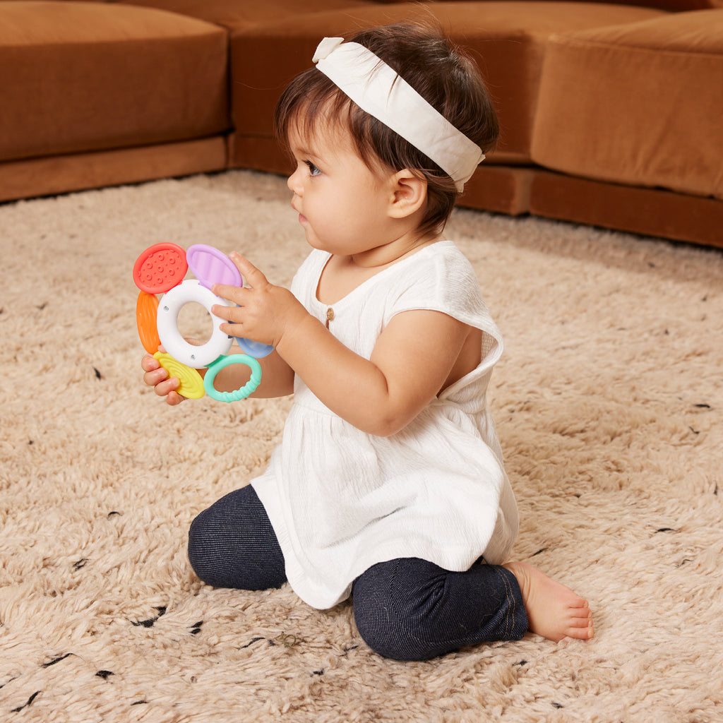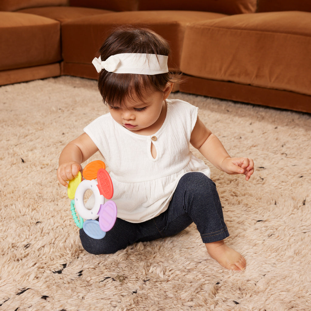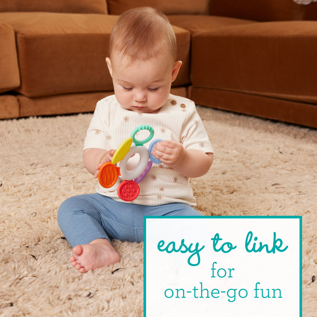 - The colorful, BPA-free multi-textured rattle with twist and click flaps stimulates the brain and supports early fine motor and cognitive skills