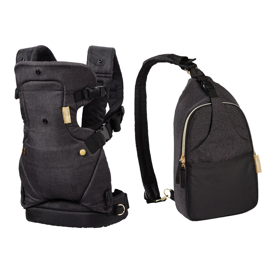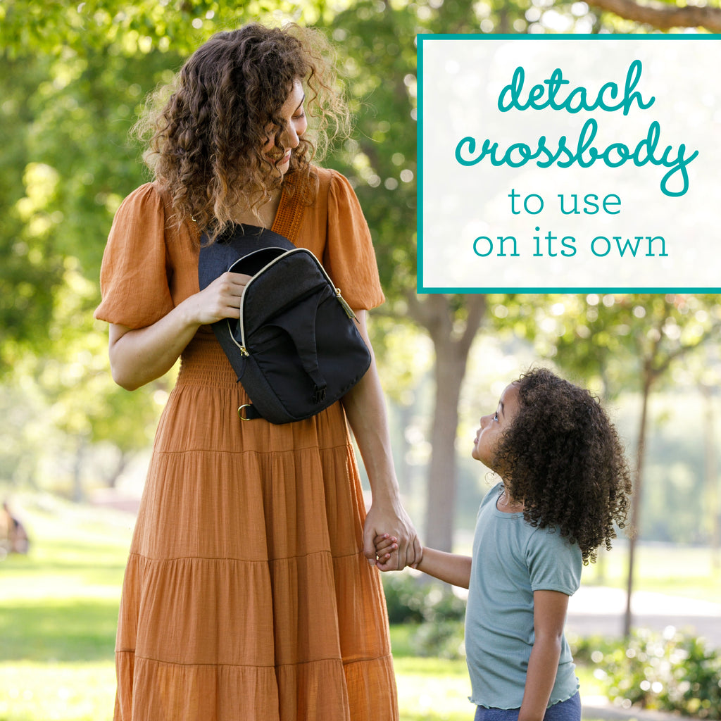 Includes a convertible baby carrier and a crossbody diaper bag that seamlessly connects, designed for optimal function and style.