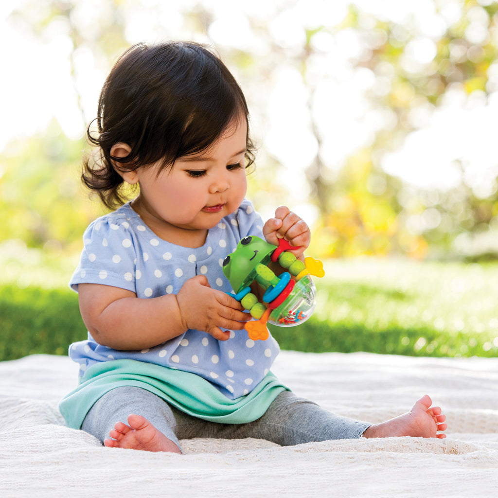 This action-packed toy is more than just a rattle. There are so many activities ready for little hands to discover. Flip-flop the frog to listen to the colored beads roll and bounce. Spin his arms and legs and slide the rings up and down. He's easy to hold and ready to play.