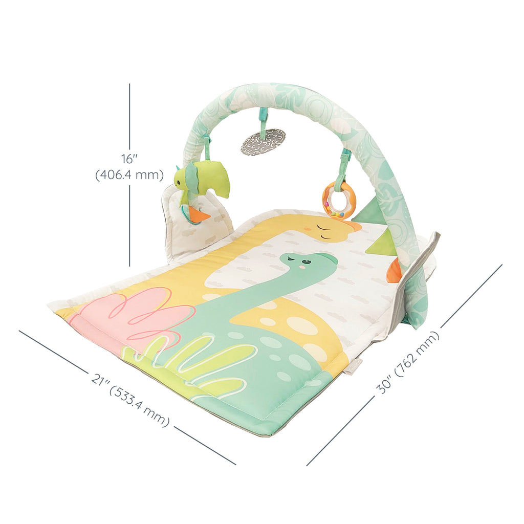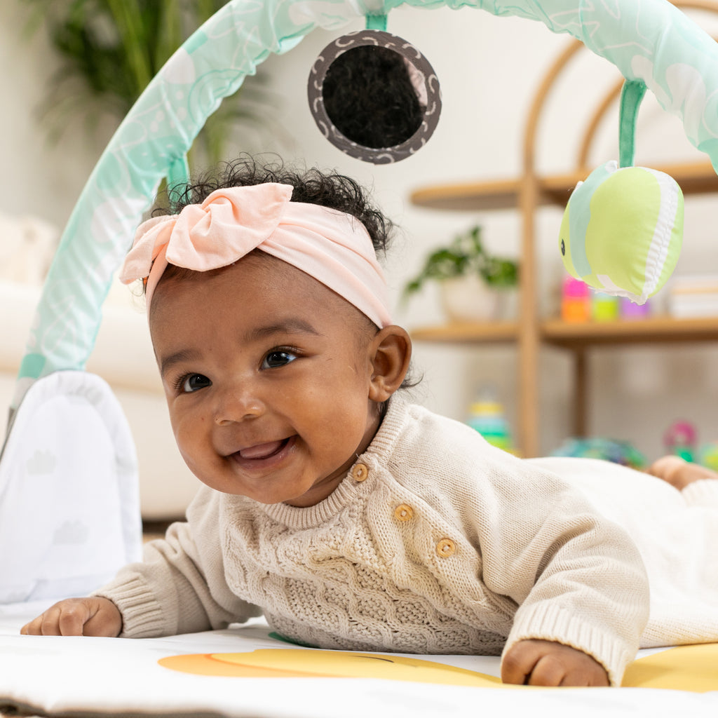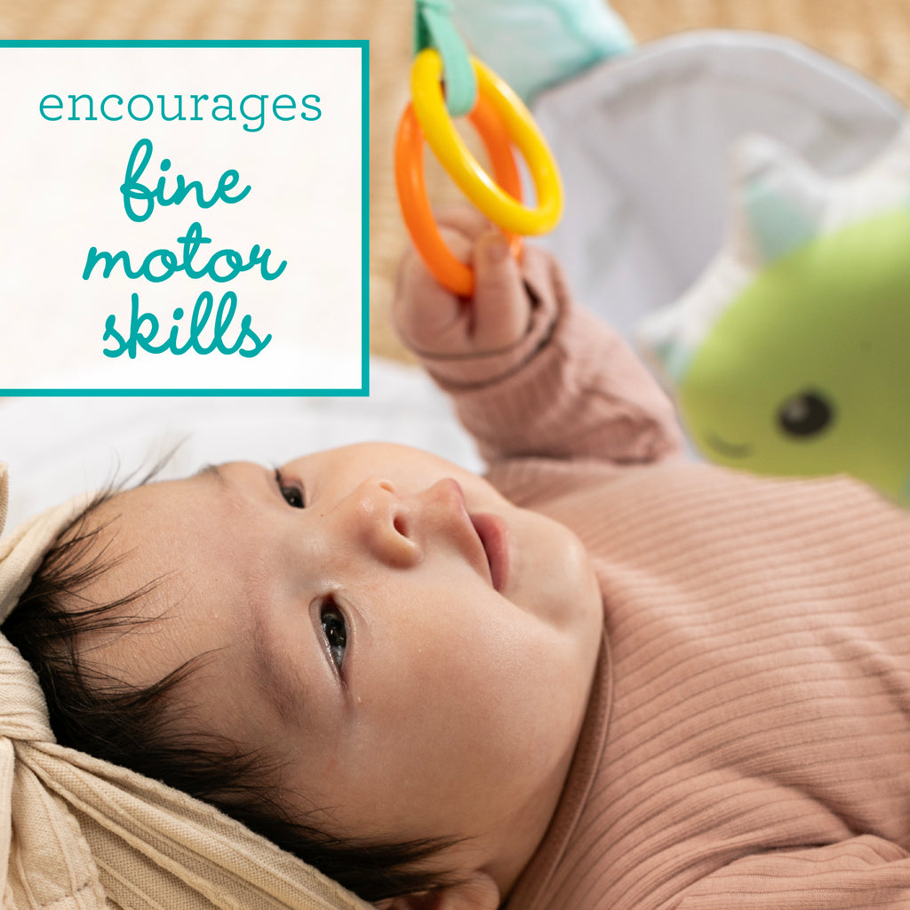 - Three hanging toys engage curious little hands and promote fine motor skills