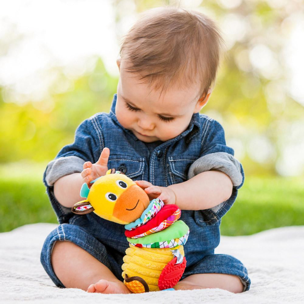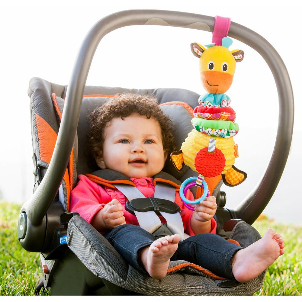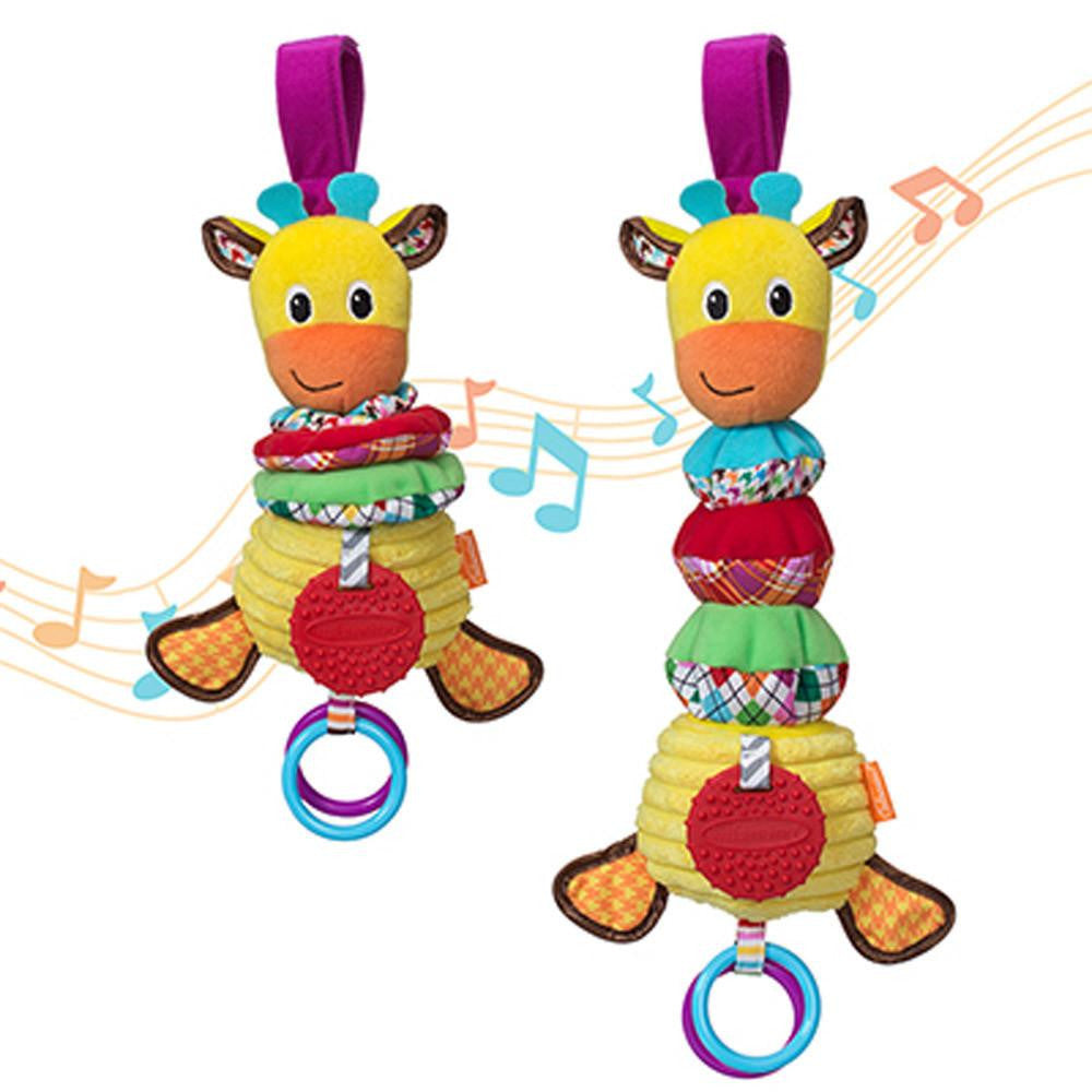 Entertain little ones at home or on the go with this huggable, tuggable musical giraffe! Easy to hang from car seats or strollers. Just pull on her rings to stretch out her colorful neck to its full length. Then, listen to the giraffe sing her sweet lullaby as she slowly climbs up again. Includes clacker rings for pulling and playing as well as a textured teether.