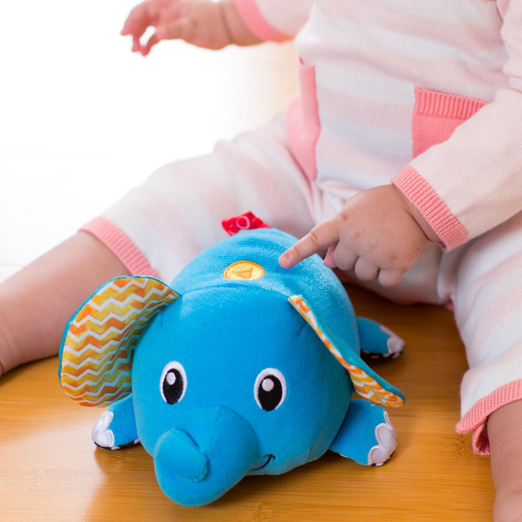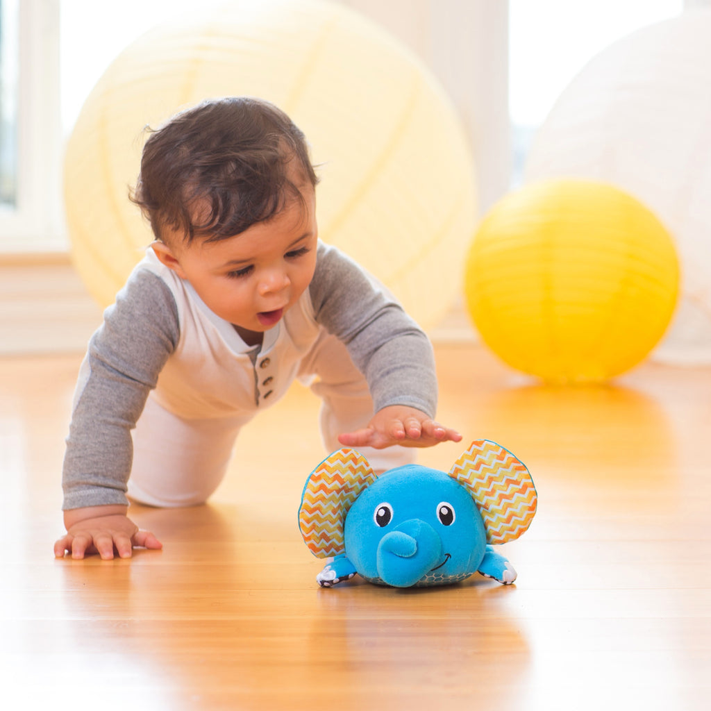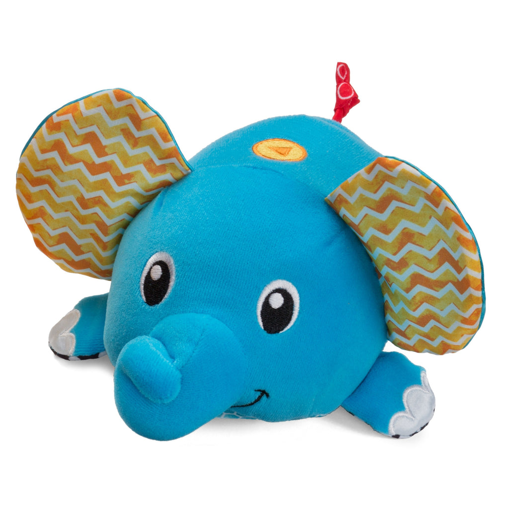 This fun musical pal jitters and shakes. Press the button on his head to watch this colorful musical lion scoot along and sing a song. Fun to chase for little crawlers. The elephant's ears are crinkly to the touch.