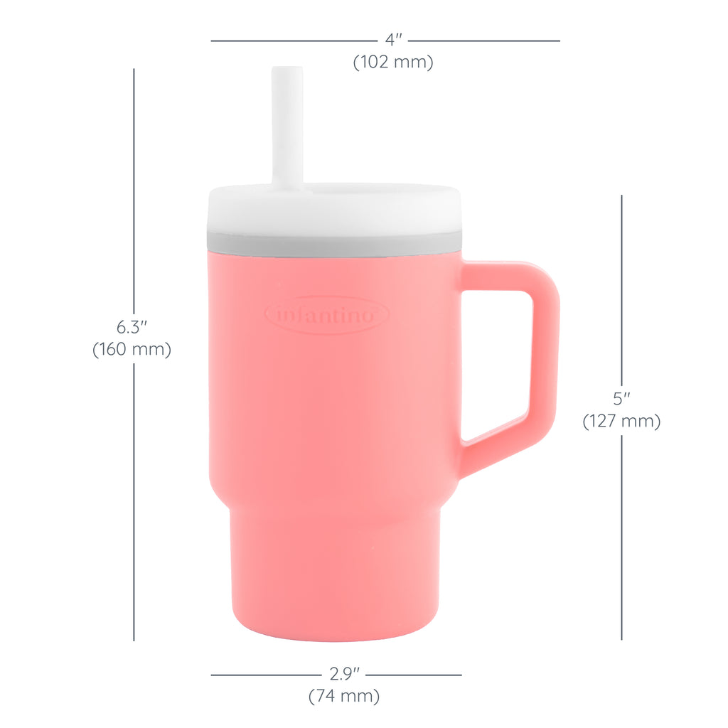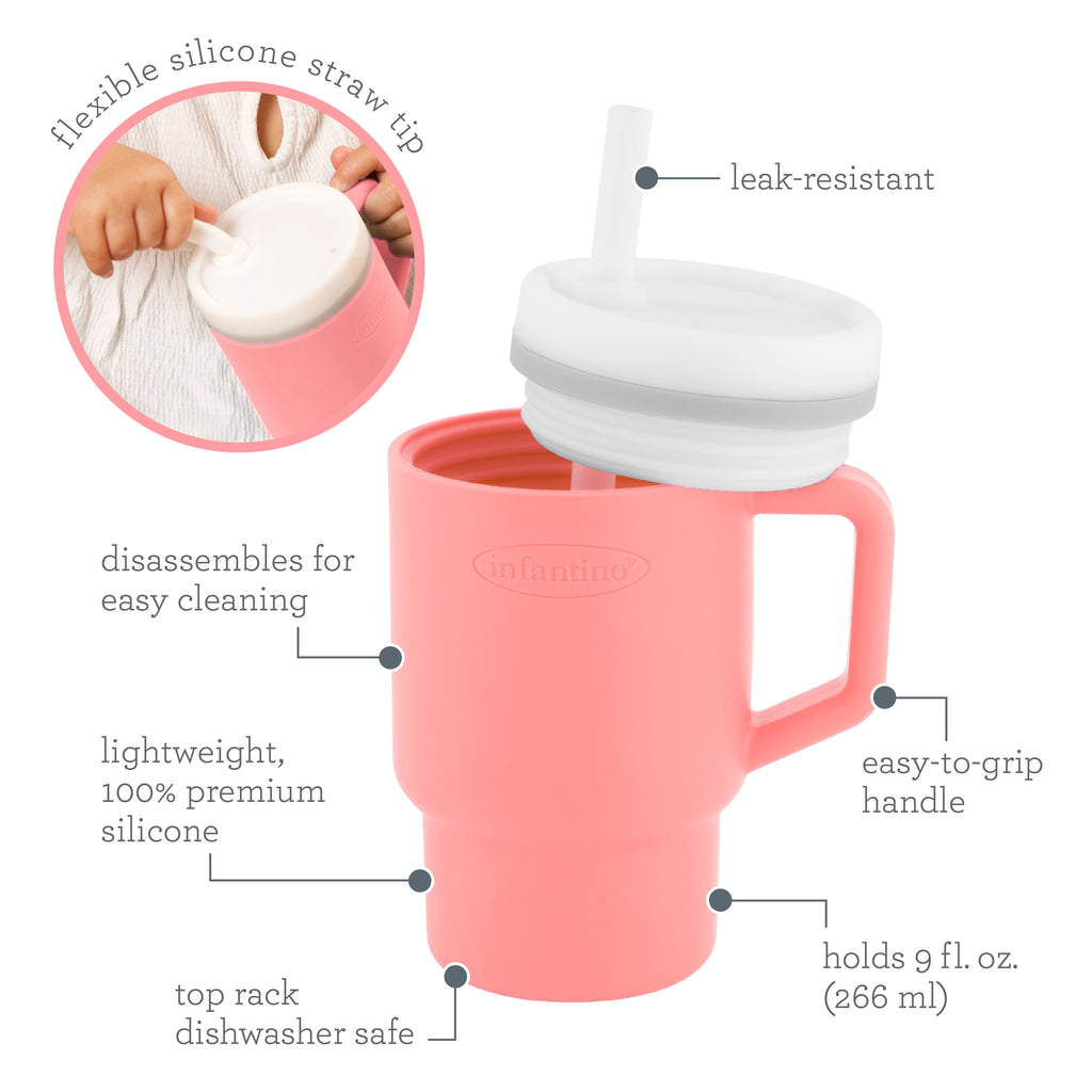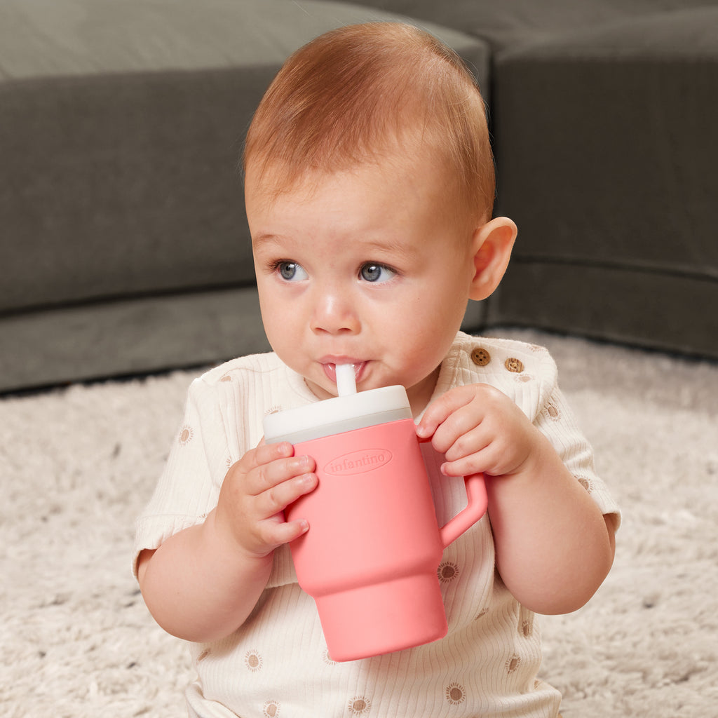 Meet the Infantino My 1st Tumbler, the perfect sidekick to keep your little one hydrated! This adorable 9oz tumbler is designed for babies who are just starting to sip on their own. Crafted from lightweight, 100% premium silicone, it's perfectly sized for tiny hands. The two-piece, leak-resistant straw includes a smart valve that ensures smooth liquid flow and prevents spills, even if the tumbler is turned upside down. The no-pull-out straw features a soft silicone tip, making it ideal for those initial precious sips. It also has a handle for easy carrying and fits most cup holders, so it’s always within reach. Cleaning is simple—disassemble and place it on the top rack of your dishwasher or handwash with warm, soapy water.
