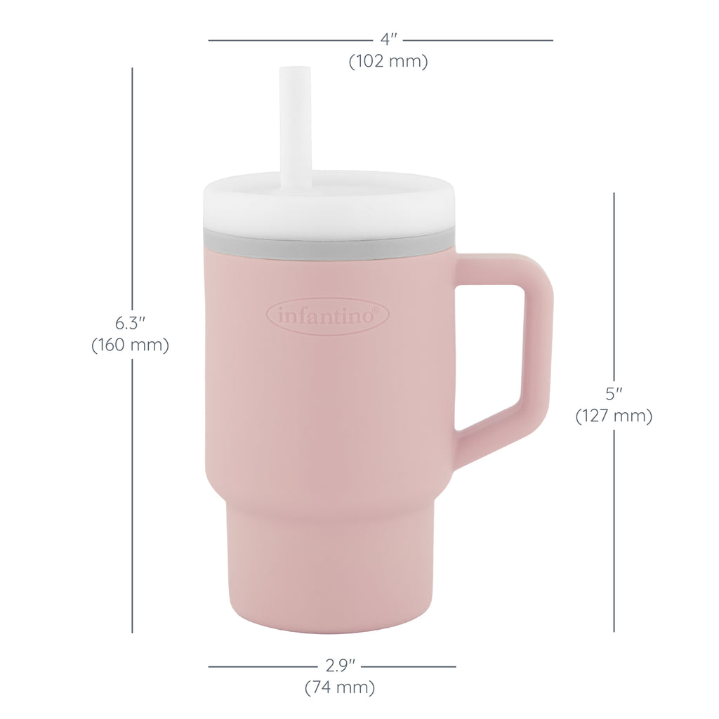Meet the Infantino My 1st Tumbler, the perfect sidekick to keep your little one hydrated! This adorable 9oz tumbler is designed for babies who are just starting to sip on their own. Crafted from lightweight, 100% premium silicone, it's perfectly sized for tiny hands. The two-piece, leak-resistant straw includes a smart valve that ensures smooth liquid flow and prevents spills, even if the tumbler is turned upside down. The no-pull-out straw features a soft silicone tip, making it ideal for those initial precious sips. It also has a handle for easy carrying and fits most cup holders, so it’s always within reach. Cleaning is simple—disassemble and place it on the top rack of your dishwasher or handwash with warm, soapy water.