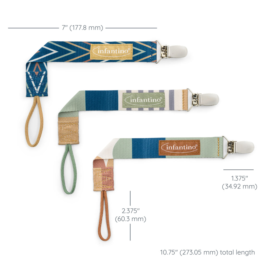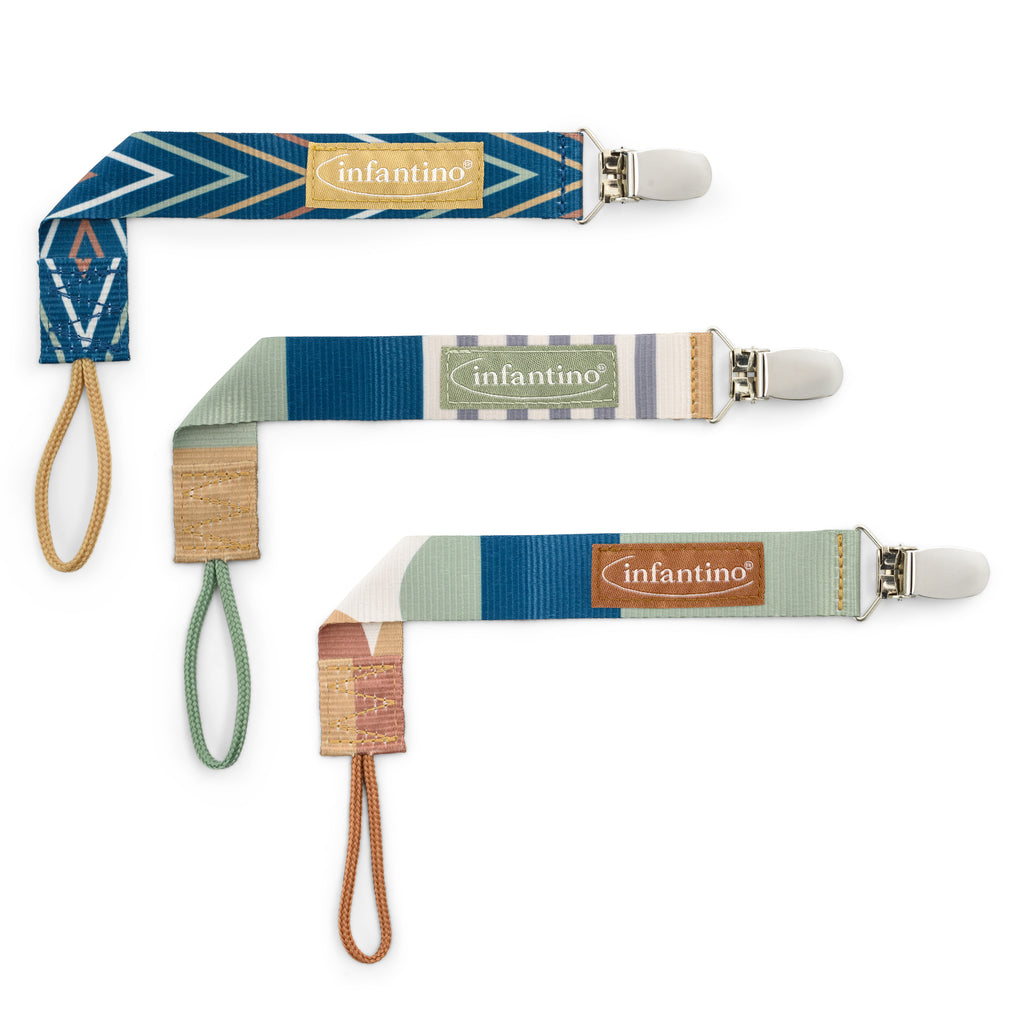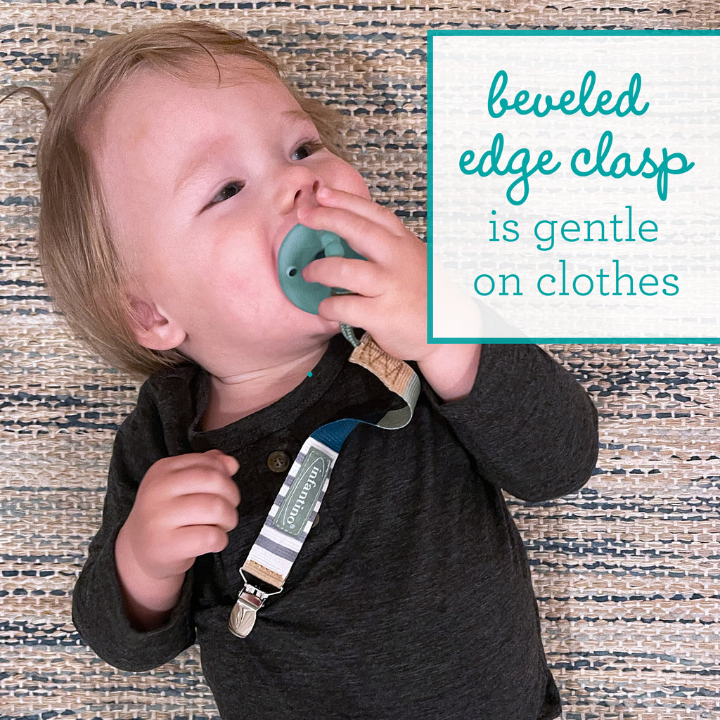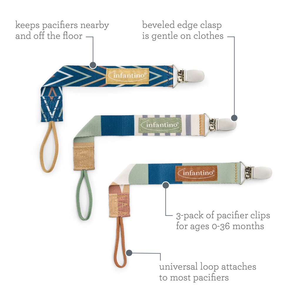 The BooginHead PaciGrip by Infantino is a must-have accessory for keeping pacifiers within reach. Designed for babies aged 0-36 months, this 3-pack of pacifier clips guarantees that your little one's pacifier remains secure and off the floor. The universal loop of the PaciGrip easily attaches to most pacifiers, offering convenience for busy parents. Its beveled edge clasp is designed to be gentle on clothing, preventing any damage or discomfort.  Furthermore, the PaciGrip is easy to hand wash and dry flat, making it both practical and essential for everyday use. With its thoughtful design, the PaciGrip is an invaluable accessory that pairs with most pacifiers.