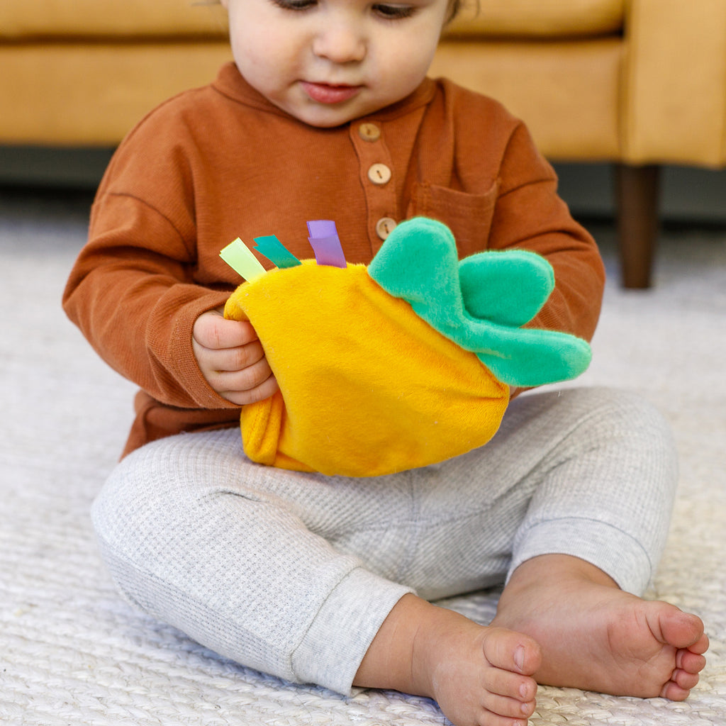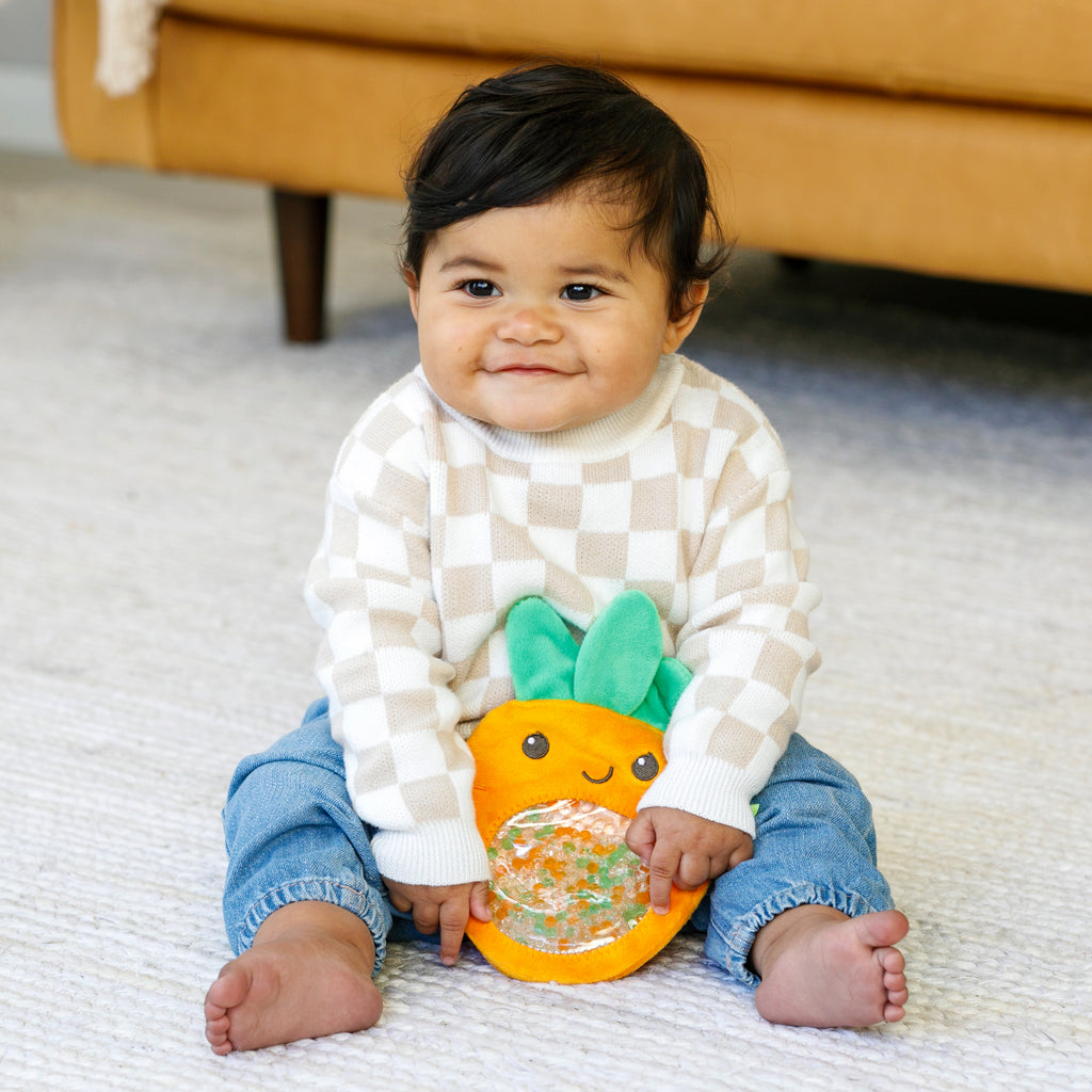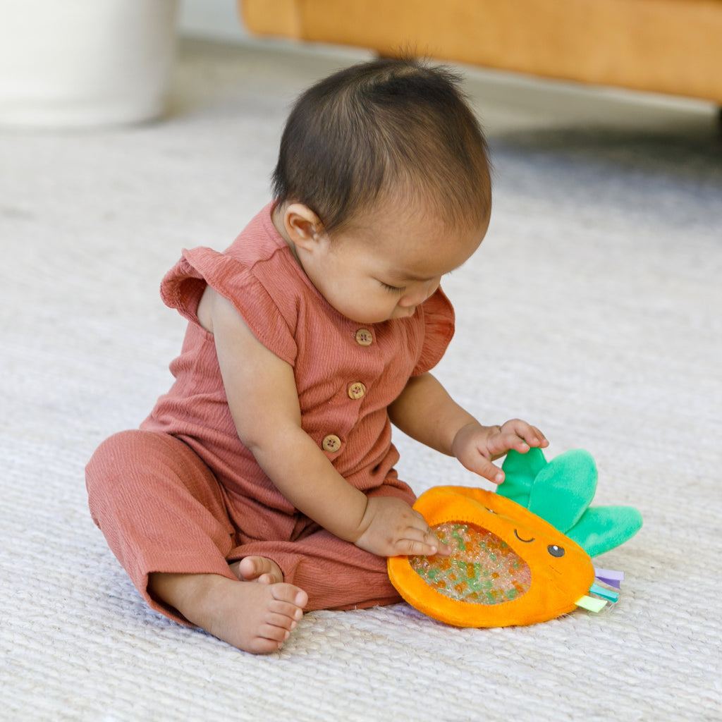 Babies will go gaga for this irresistible, mess-free Seek & Squish Sensory Pal. There's no fun like squishy and squeezing the carrot’s belly. Babies and toddlers alike will find joy in playing with this sensory exciting pal that encourages fine motor skills. They will enjoy exploring encased colorful squishy beads, soft fiddle flags, engaging crinkly leaves, and premium snuggly textures. The Seek & Squish by Infantino makes the perfect basket stuffer this holiday!