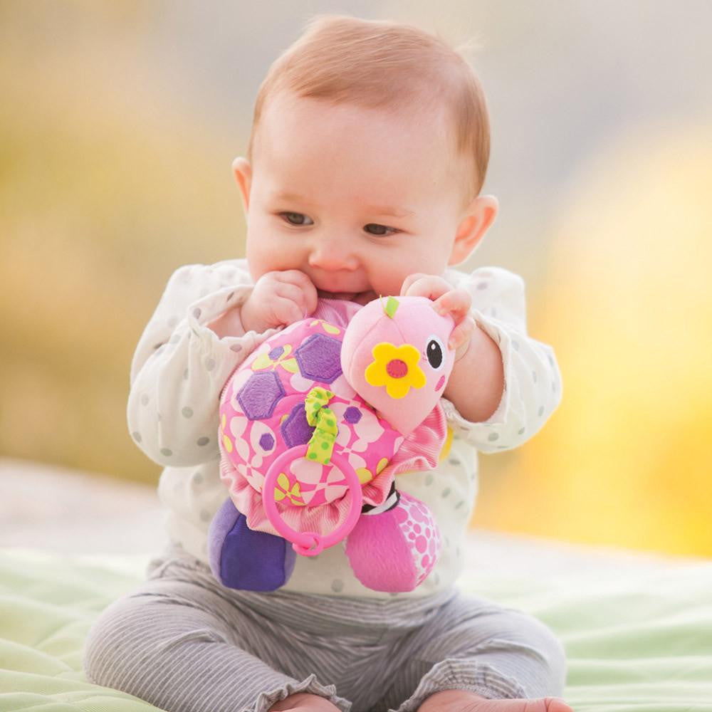 This sweet, linkable turtle encourages reaching, grabbing, batting and lots of grins. Her mirrored belly is perfect for peek-a-boo play! And, shake her to hear a fun rattling sound. Links to car seats, strollers, activity gyms and more.