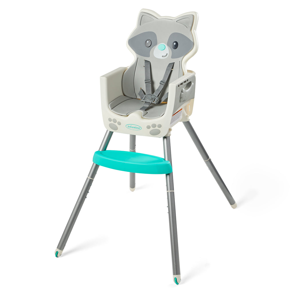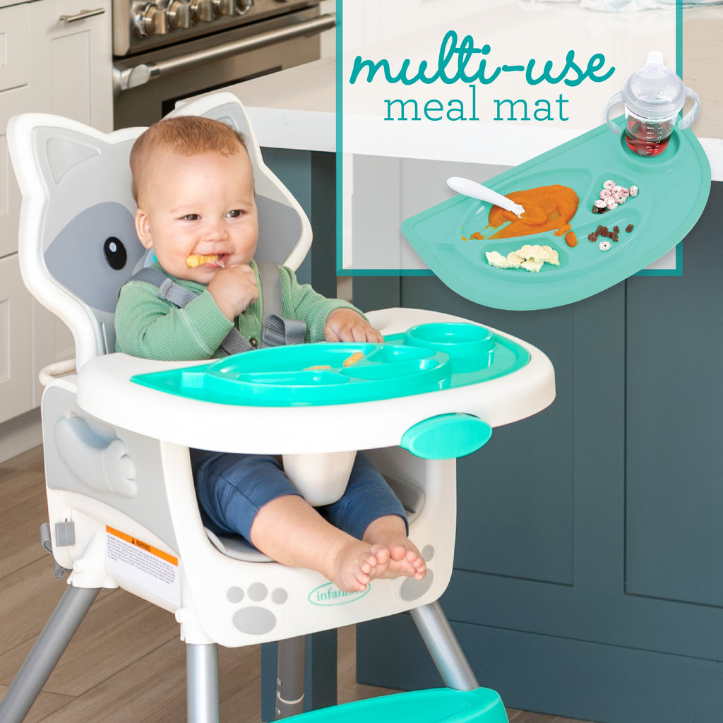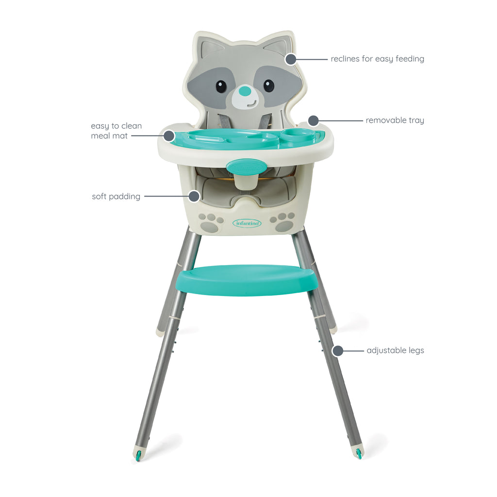 This 4-in-1 high chair transforms into a space saver, booster and toddler chair. Features a dishwasher safe multi-functional meal mat and easy release removable food tray. Food tray and seat back are adjustable for ideal positioning from tiny to toddler. Cushioned, low-density foam padding is soft for baby, and easy to clean for parents.