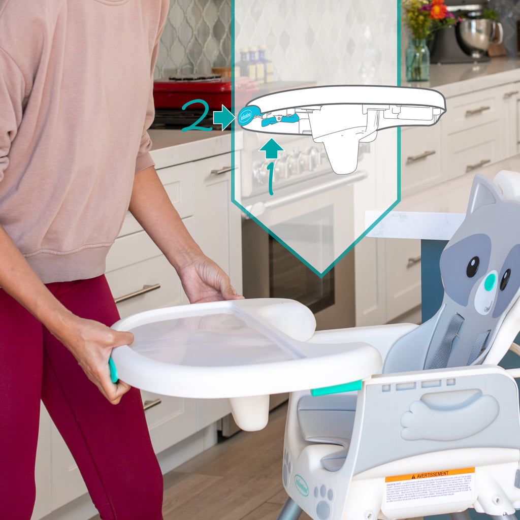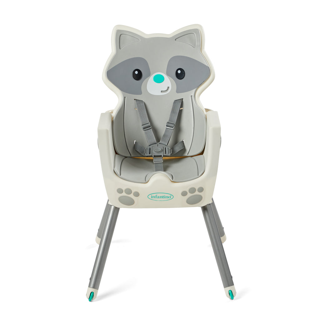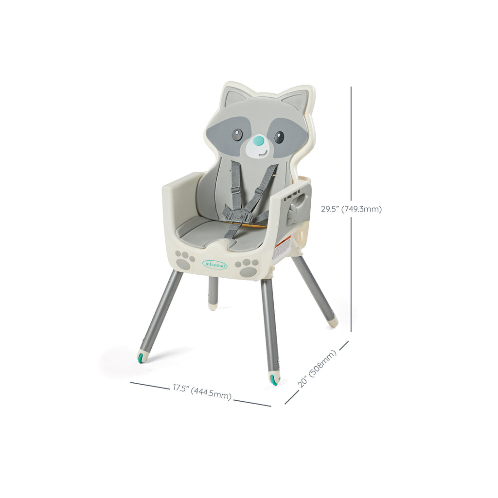 This 4-in-1 high chair transforms into a space saver, booster and toddler chair. Features a dishwasher safe multi-functional meal mat and easy release removable food tray. Food tray and seat back are adjustable for ideal positioning from tiny to toddler. Cushioned, low-density foam padding is soft for baby, and easy to clean for parents.