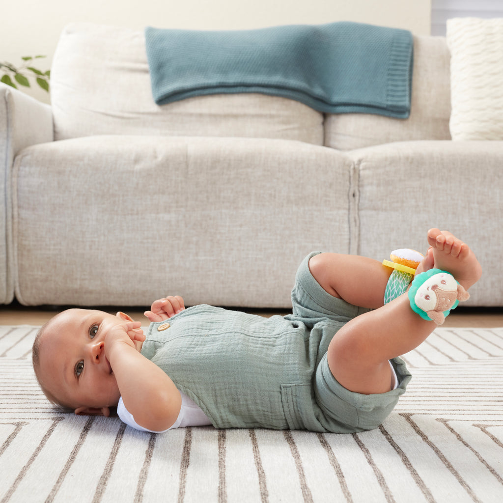 - Includes 2 easy-to-adjust wrist rattles that can also be used on baby's ankles as foot rattles
