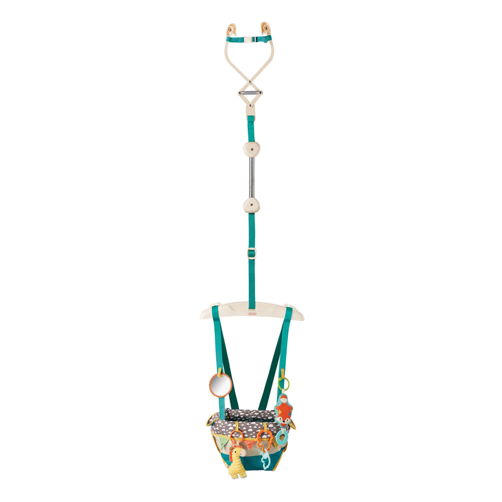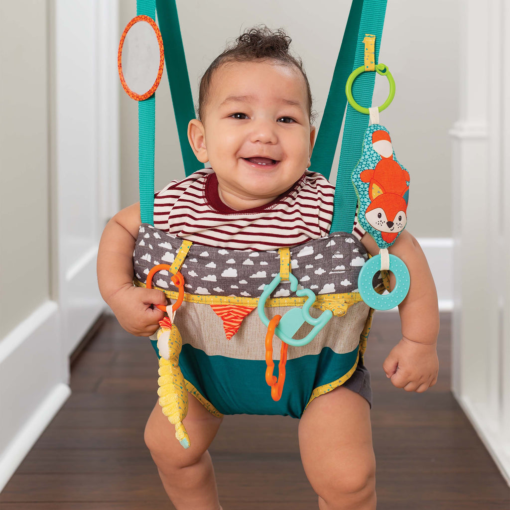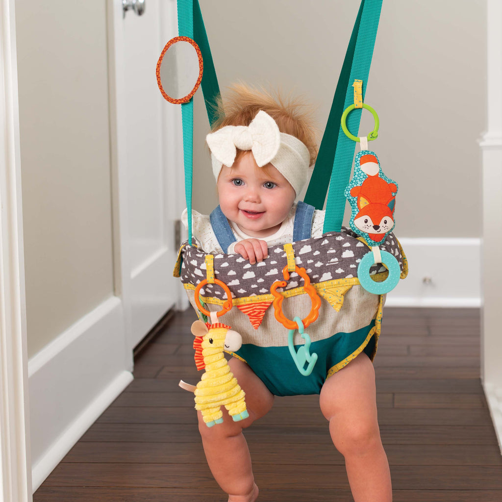 Babies will go gaga for this bounce n' play Up, Up & Away Doorway Jumper with four richly textured, removable toys. This lightweight jumper is easy to pack for big adventures or to store between uses. The soft seat is machine washable. Safety straps are adjustable for little one's height and are wide set to make it easy to put baby in and out. Toys include a ribbon tail giraffe, crinkly fox with teether, mirror, and animal parade links.