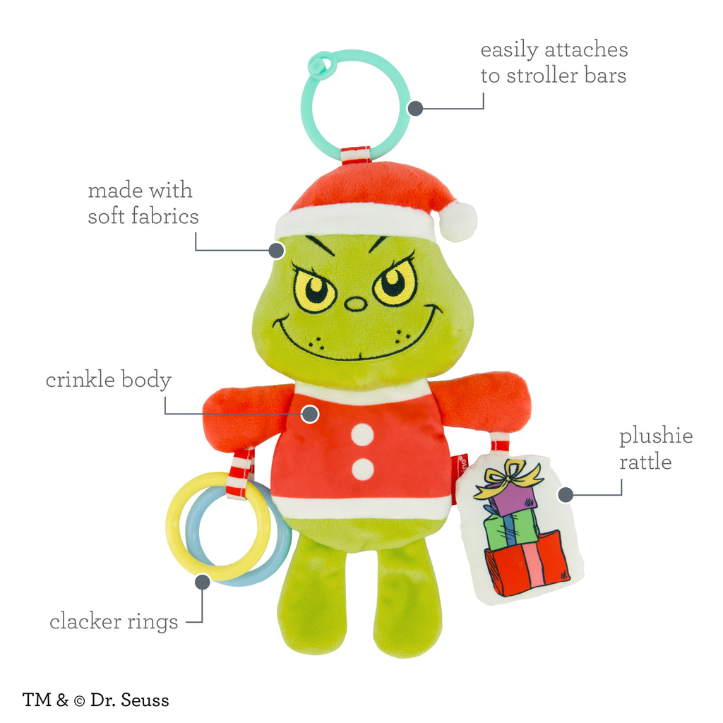 Celebrate the holidays with the Infantino Activity Pal – The Grinch, a jolly companion designed to make playtime merry and bright! With crinkle sounds, clacker rings, and rattling presents, this soft activity toy keeps babies engaged while supporting early sensory development. Its lightweight design and easy clip-on feature make it perfect for attaching to strollers, car seats, or diaper bags for festive fun on the go. Whether it’s a stocking stuffer or a holiday gift, this cheerful Grinch toy is sure to bring giggles and Who-ville magic to every adventure.