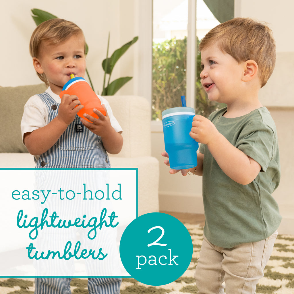 Double the sipping fun with the Infantino My 1st Tumbler 2-Pack! These are the perfect starter cups for toddlers ready to drink on their own. Each 10oz tumbler is lightweight, easy to grip, and features a built-in handle that’s just right for little hands. The soft silicone straw tip is gentle on little mouths and gums. A smart valve helps prevent spills and messes, even when flipped upside down. Made from BPA-free plastic, these cups are safe for daily use and durable enough to handle drops, tosses, and tumbles. Designed to fit most stroller and car seat cup holders, they’re great for home, daycare, or on-the-go adventures. All parts are top-rack dishwasher safe for easy cleanup.