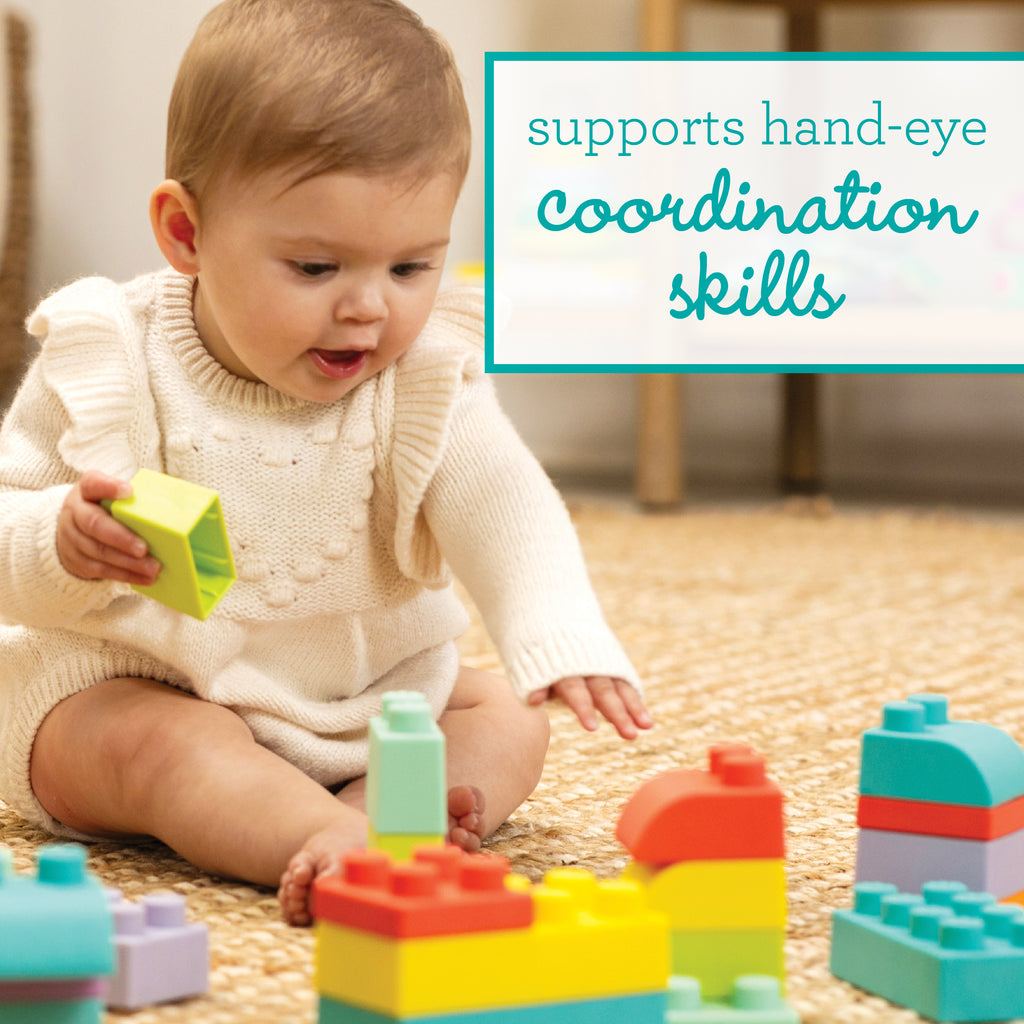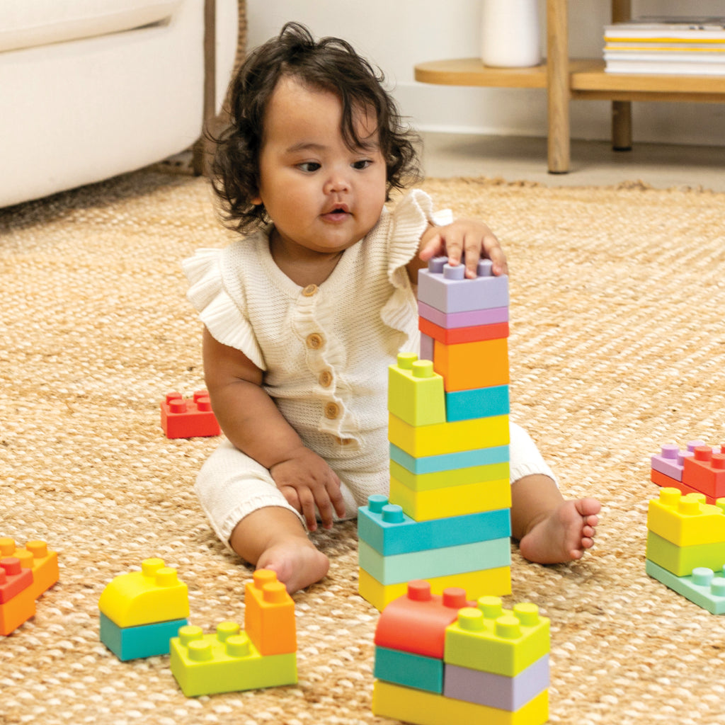 Introduce your little one to the joy of building and creativity with the Infantino Super Soft 1st Building Blocks Jumbo Playset. Designed to be a parent's and baby's favorite, this jumbo 43-piece set offers lots of play possibilities. These blocks are crafted to be super soft and gentle on your baby's delicate hands—and your feet! Whether stacked high or played with individually, these must-squeeze blocks provide a sensory delight that your baby will love.
