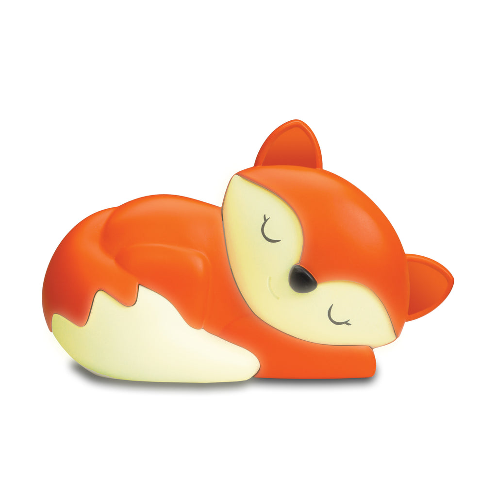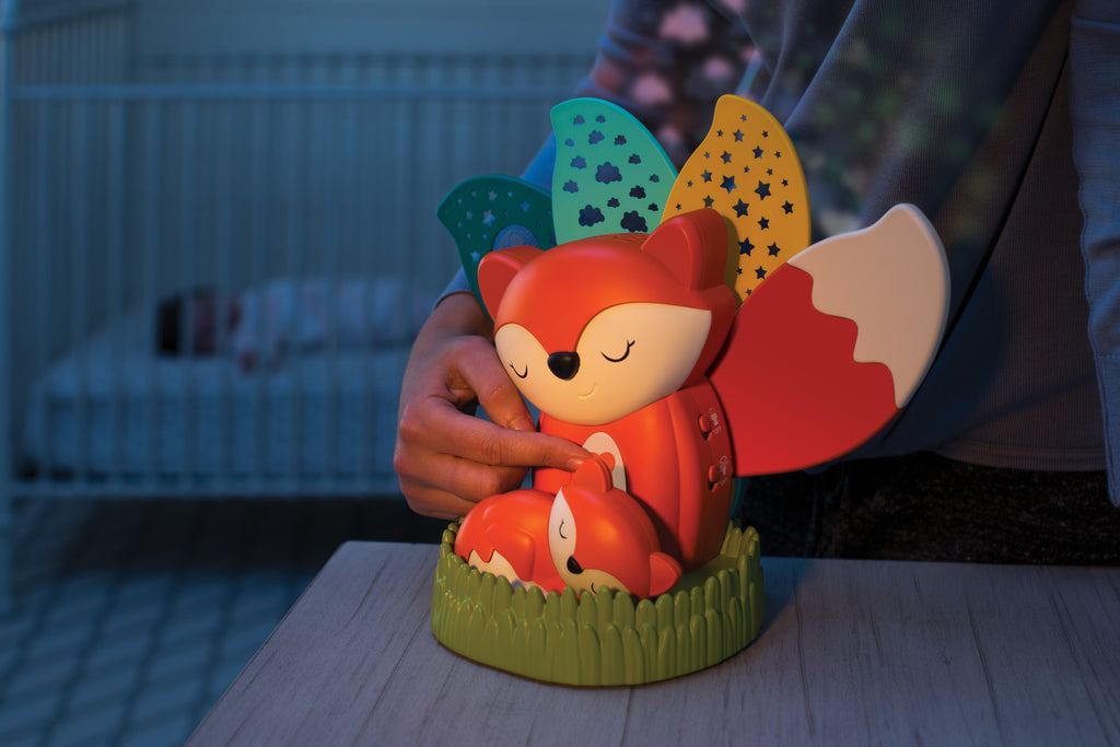 Ease your baby into peaceful slumber with this soothing fox night light that plays lullaby music while projecting a colorful, moving light display. Features 20 minutes of music or nature sounds, including 5 songs and 3 nature sounds. The gentle movement of the fox’s tail brings motion to the light projection, creating visual interest and promoting eye tracking and focus. The baby fox is removable, for a night light little ones can hold. Adjustable light and music settings, to use with or without audio.
