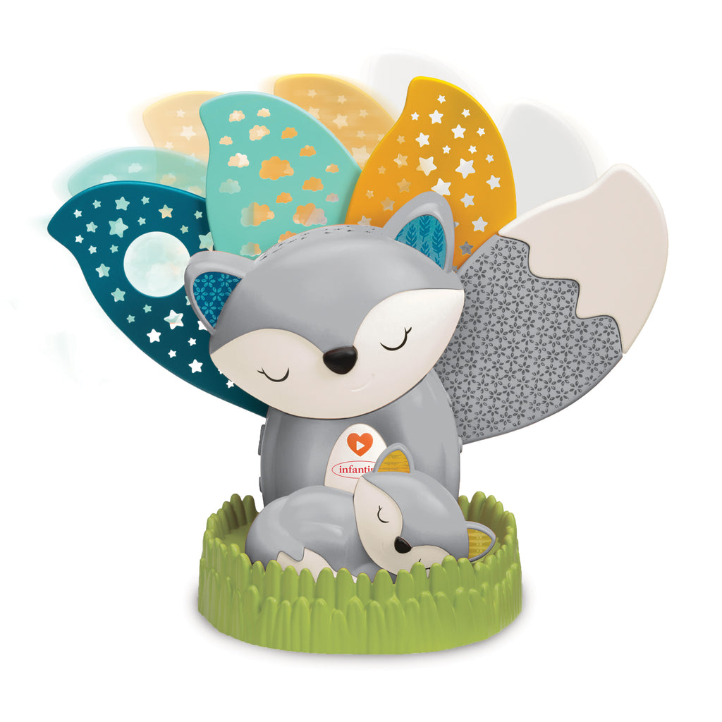 Babies will go gaga for this soothing fox night light that plays lullaby music while projecting a colorful, moving light display. Features 20 minutes of music or nature sounds, including 5 songs and 3 nature sounds. The gentle movement of the fox’s tail brings motion to the light projection, creating visual interest and promoting eye tracking and focus. The baby fox is removable, for a night light little ones can hold. Adjustable light and music settings, to use with or without audio.