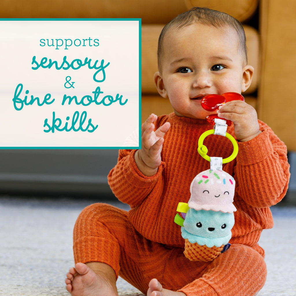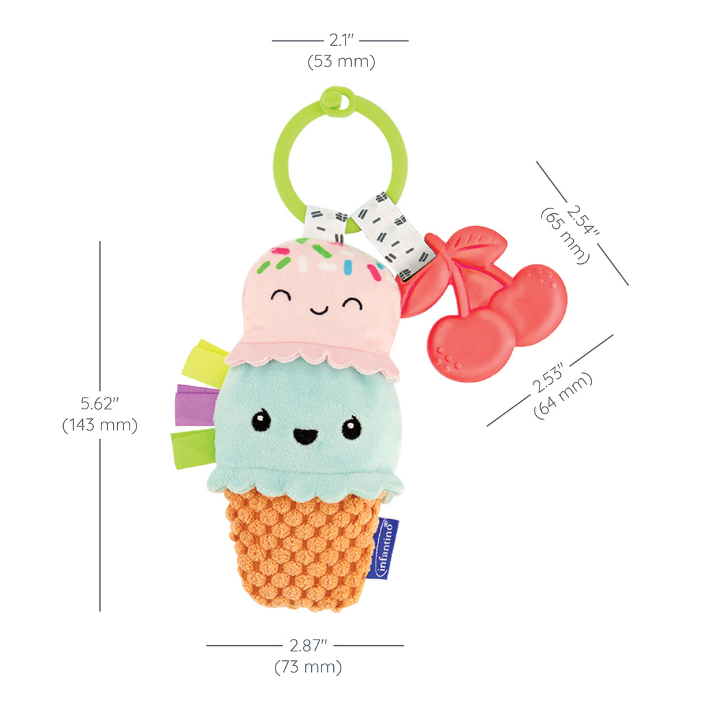 Babies will love engaging with this whimsical toy and teether. A soft fabric ice cream cone and two friendly scoops are perfectly sized for curious hands to explore. Little nibblers are naturally drawn to the BPA-free textured cherry teether to soothe their tender gums. Attach it to a stroller bar or activity gym to encourage reach and play muscle development.