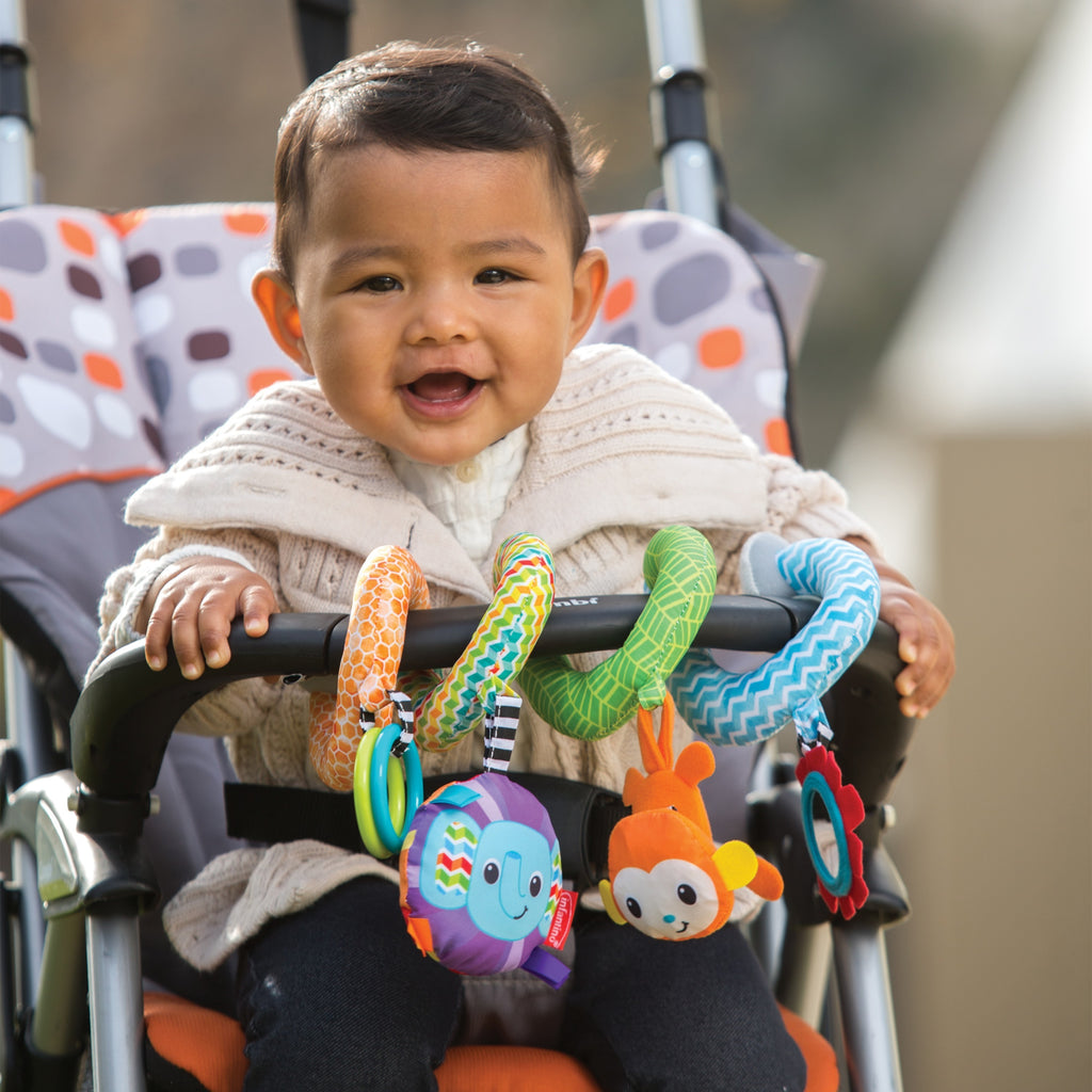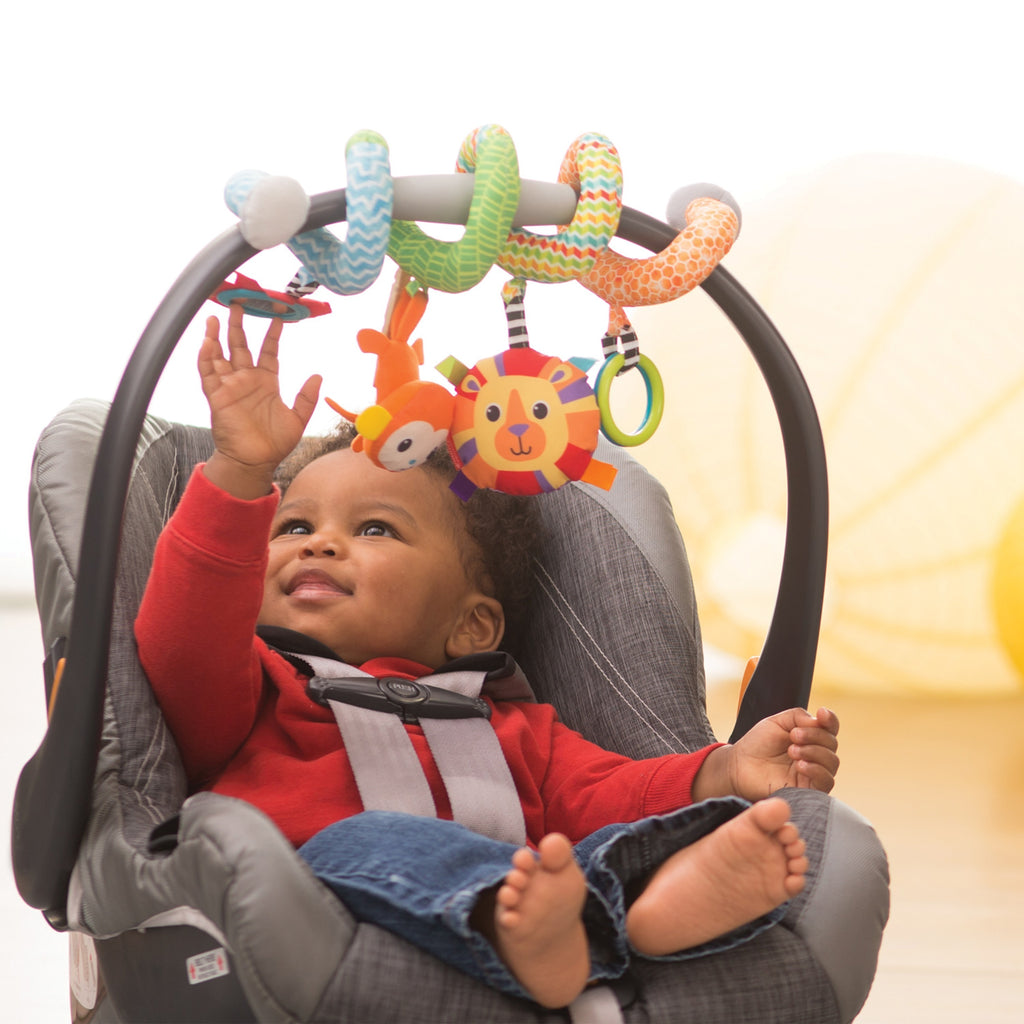 This soft activity spiral features 4 unique toys that rattle, crinkle and swing. Wraps around car seat handles and most strollers. Encourages reaching, grabbing and batting while keeping your little one engaged and interested.