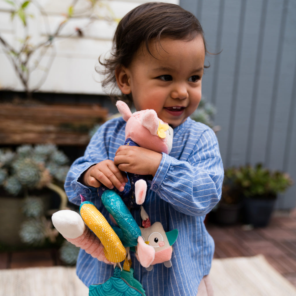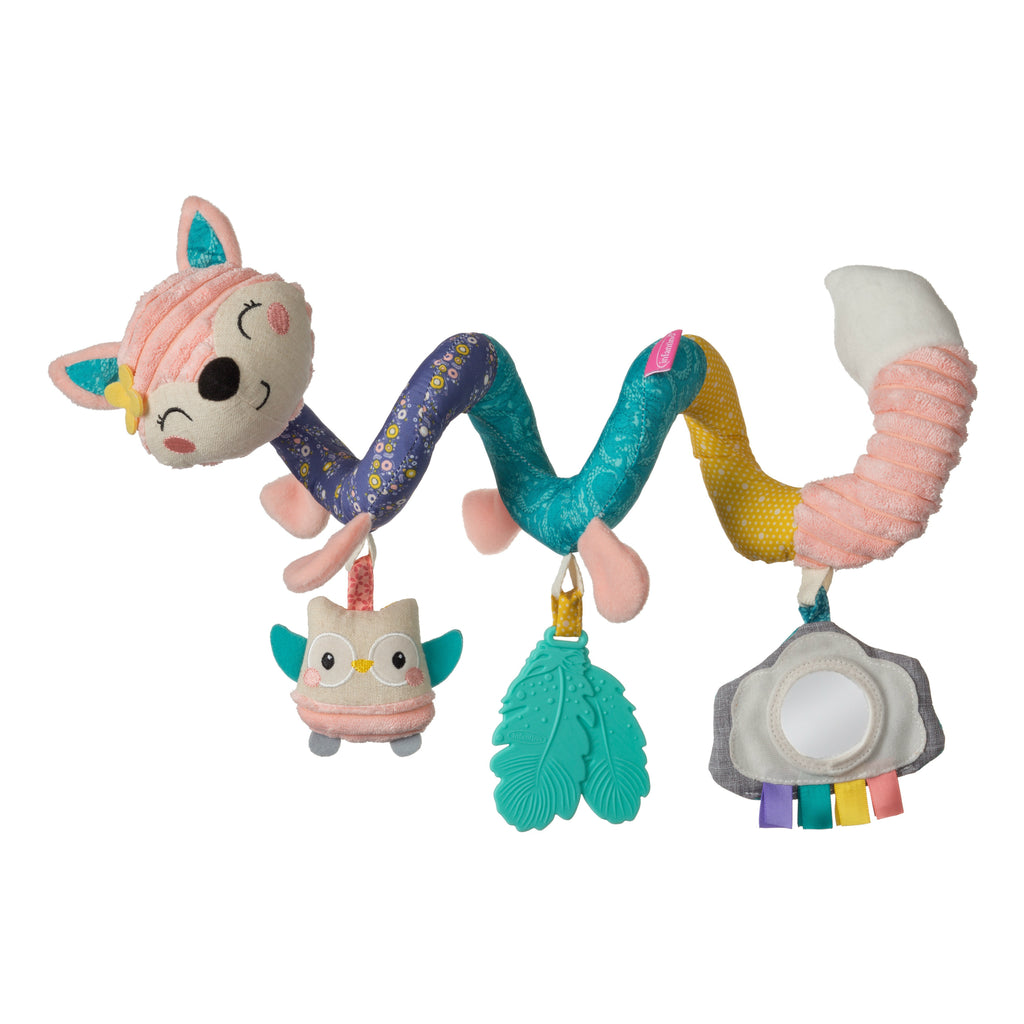 Babies will go gaga for this on-the-go spiral that keeps the fun, front and center. This car seat toy features a plush fabric spiral design that easily wraps around the handle of any car seat or even the safety seat bar of a stroller. It has four different shapes with various textures that dangle from it, making it the perfect for catching baby's eyes and imagination while they're travelling. The patchwork fabrics, soft textures, and engaging toys keep little one smiling, even on the go.