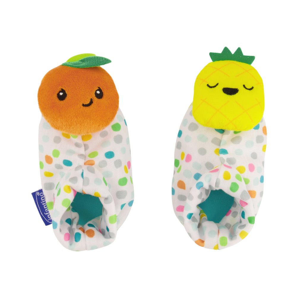 3 piece set includes: 1 pair of foot rattles, 1 pair of wrist rattles, and 1 spinning flower rattle