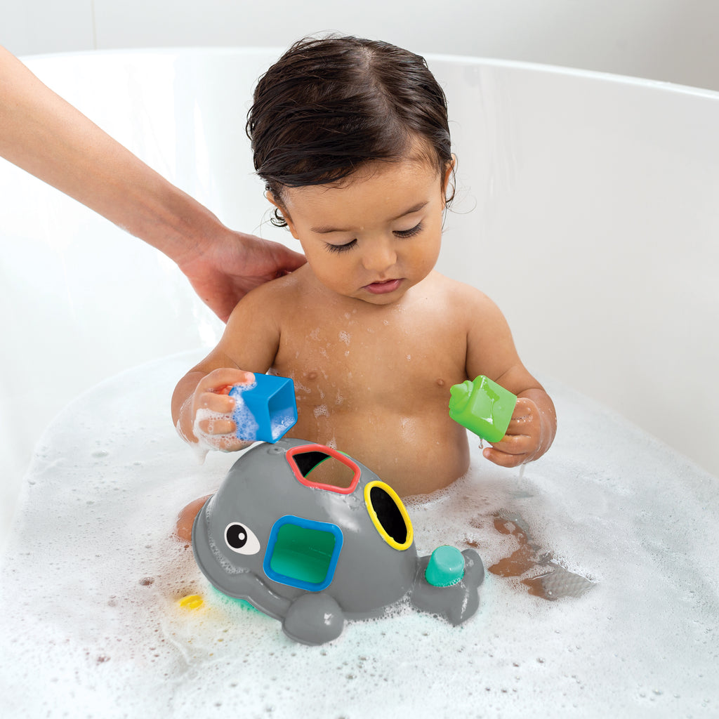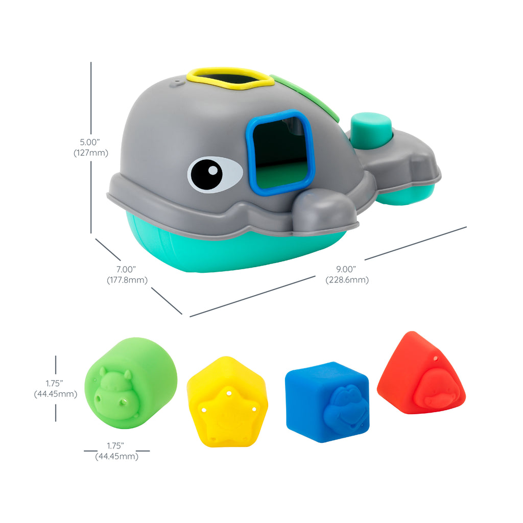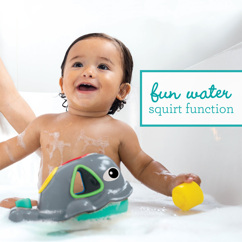 Add a splash of fun to bath time with the Infantino Orca the Whale! This adorable shape-sorting spraying whale lets babies explore and learn while having fun. With four colorful shapes to sort into their corresponding slots, little ones can also use them as water scoops! Its button-activated spray that sends a gentle squirt from the blowhole is an attractive addition to the learning playtime! Babies develop cognitive thinking and hand-eye coordination by picking up and putting back the shapes. It’s sized just right for baby hands and perfect for bath time. Let your little one explore in a fun way to play with Infantino Orca the Whale!