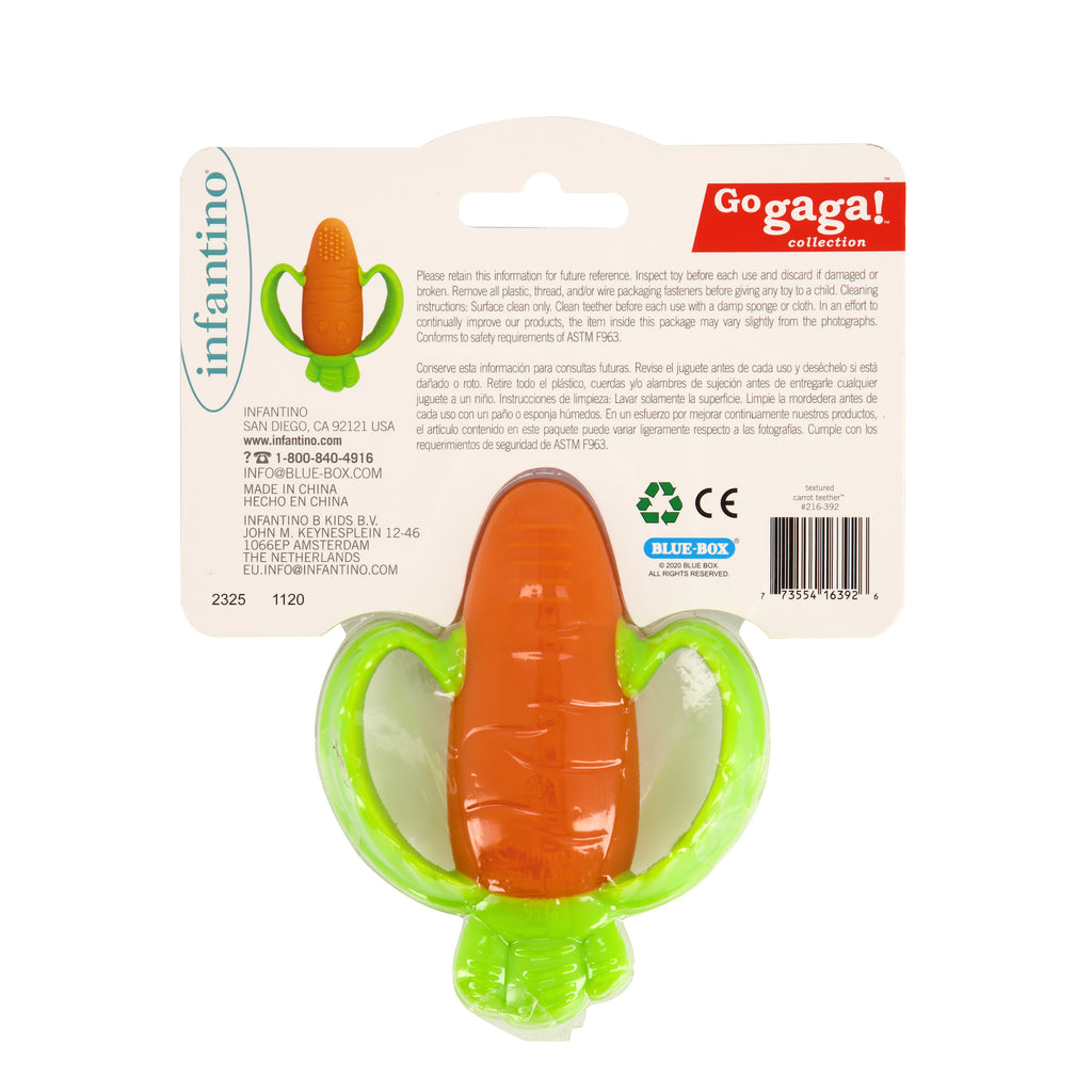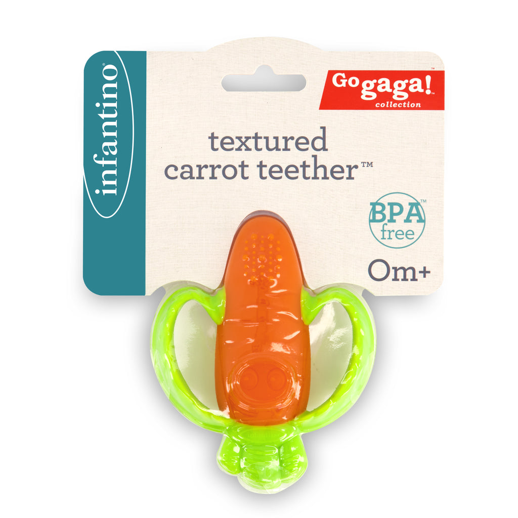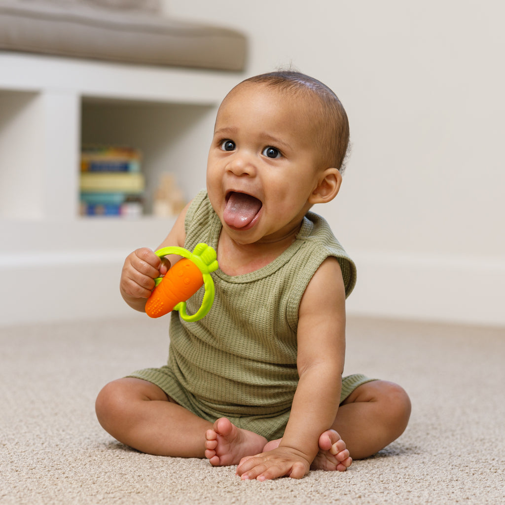 Your baby will go gaga for this soft, BPA-Free silicone carrot teether. It's perfect for soothing tender gums and providing teething relief. Easy-to-hold handles make this teether irresistible for tiny hands. Interesting textures awaken your baby's mouthing senses, encouraging them to move their tongue and jaw in new and interesting ways. These motions help your baby build muscles for eating solids, sound production, and speech development. Surface clean only. Clean teether before each use with a damp sponge or cloth.