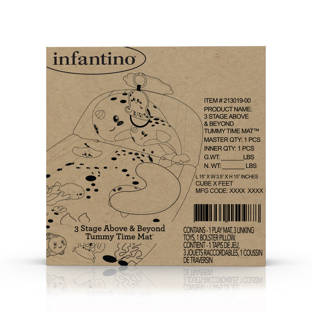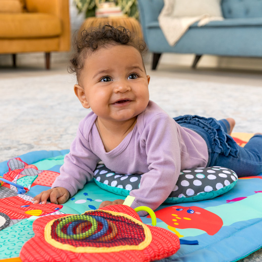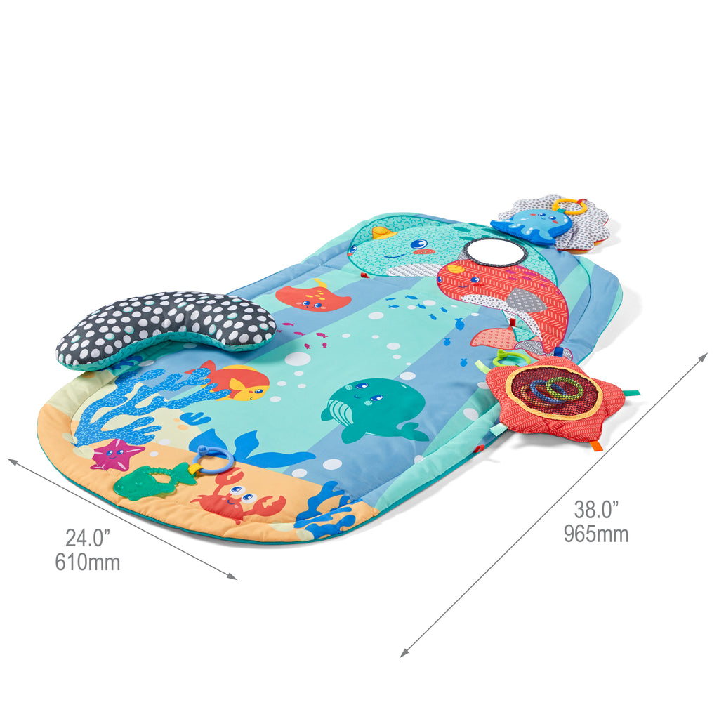 Baby will have waves of fishy fun exploring toys & strengthening developing muscles on this large ocean-themed mat. The prop-up stand creates a shell-tastic overhead game of bat & grasp for little swimmers. Prop aboard the tummy-time bolster for a view like no other that calls for giggles & wiggles. Lay the mat flat to create a captivating sea exploration of toys & giant selfie mirror. Get splashing, playing & exploring with the 3 Stage Above & Beyond Tummy Time Mat.