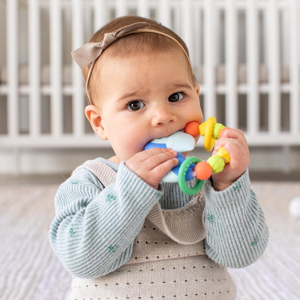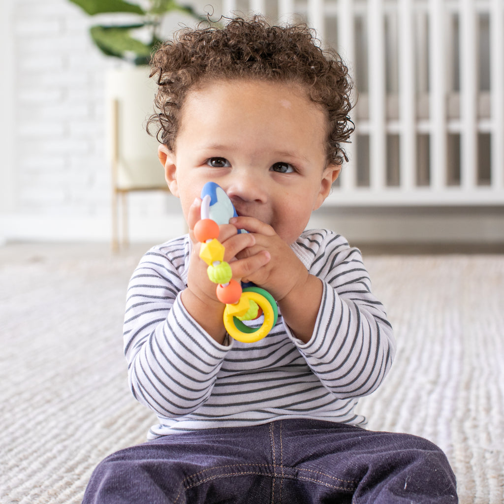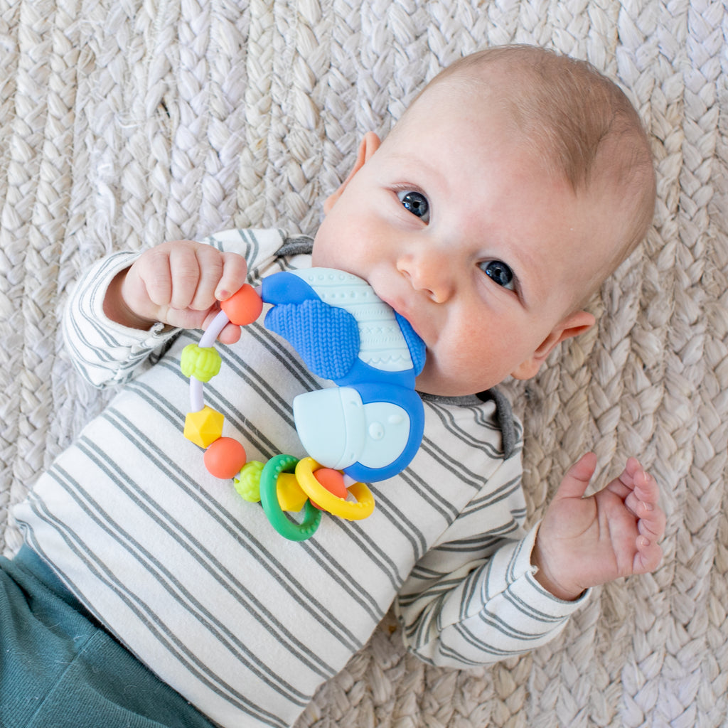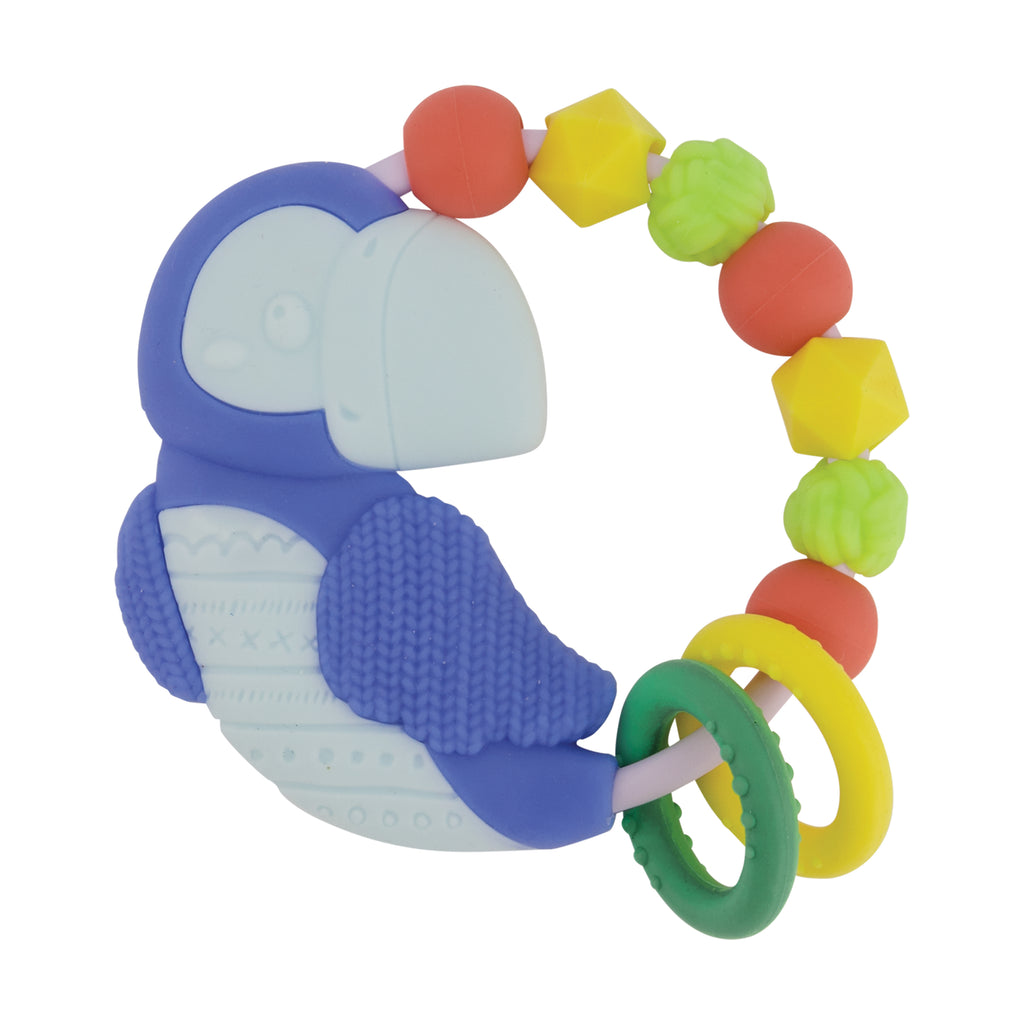 Babies will go gaga for this must-have colorful silicone bead teether designed especially for little hands to grab. Beads have marbled, knotted, and smooth surfaces for sensory development as they can also bite into and soothe their new teeth. This sweet teether also features an adorable multi-textured blue puffin with two round rings to slide up and around!