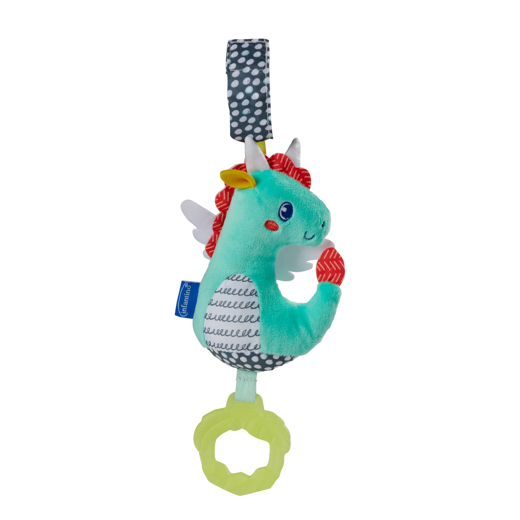 These cheerful take-along friend hide a cheerful chime inside. Includes a textured, BPA-free teether. Encourages reaching, grabbing, batting and playing. Attaches easily to car seats, strollers and activity gyms.