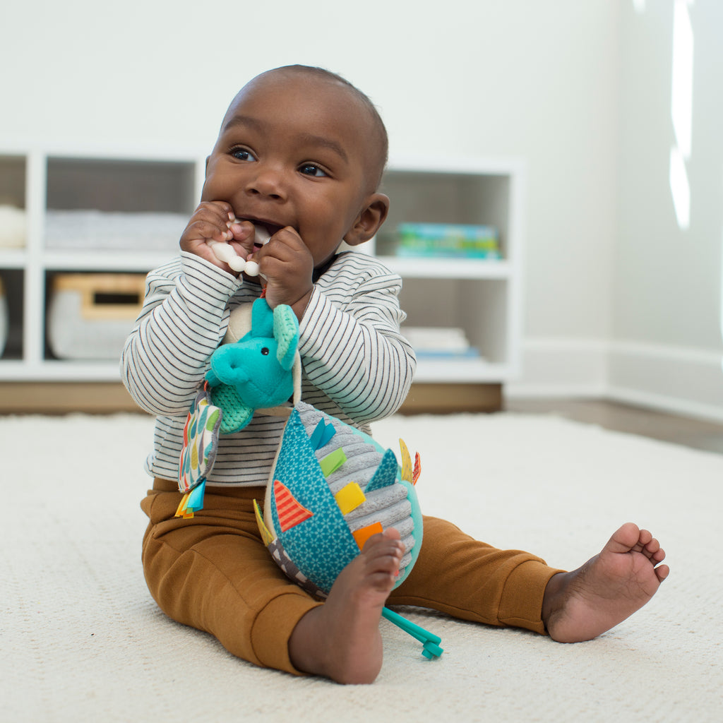 Babies will go gaga for this Playtime Pal and it's multi-sensory features. This baby toy will make use of all their senses, with bright colors, multiple different textures and rattling noises. This soft toy is the perfect size for baby to cuddle with, and also easily hangs from their car seat or stroller to keep them occupied.