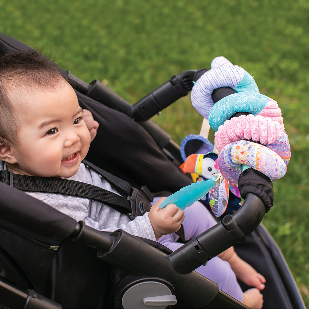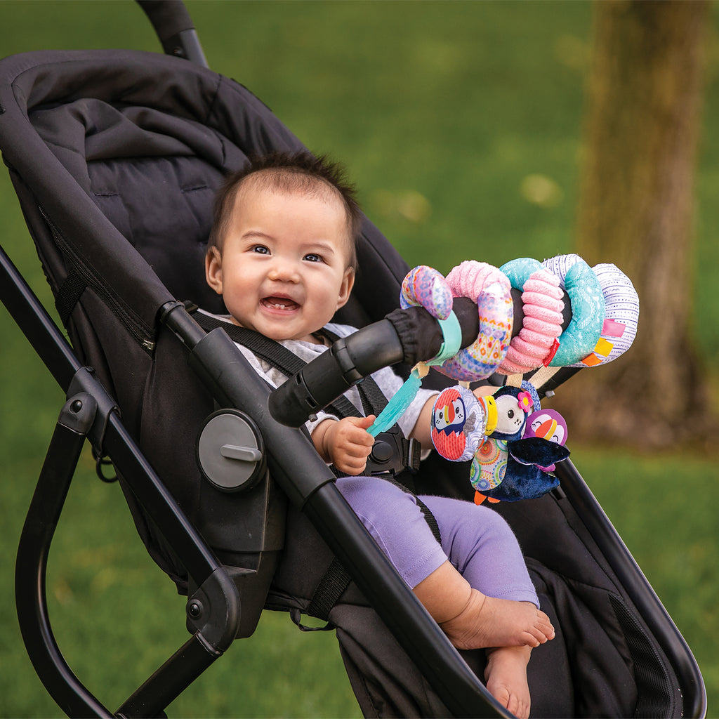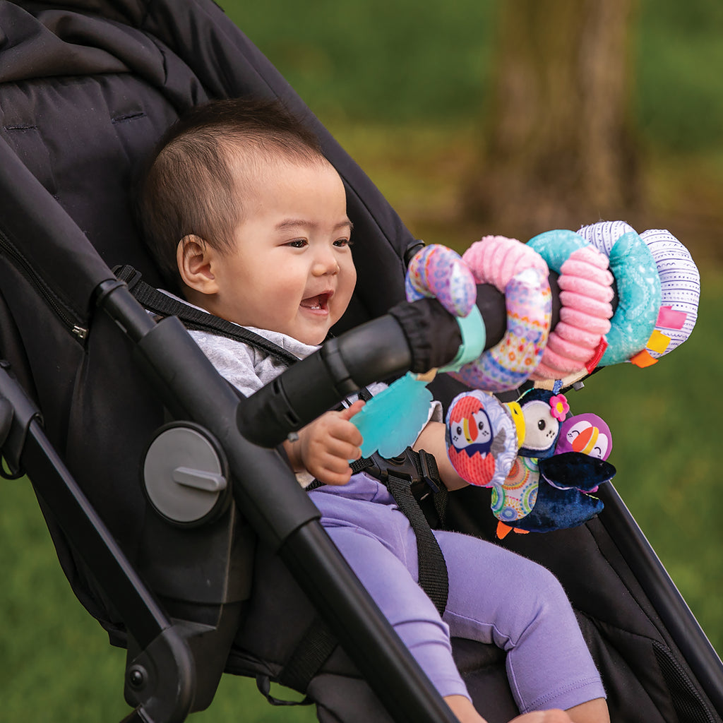 Plush fabrics and soft textures, including rattle puffin and mirror