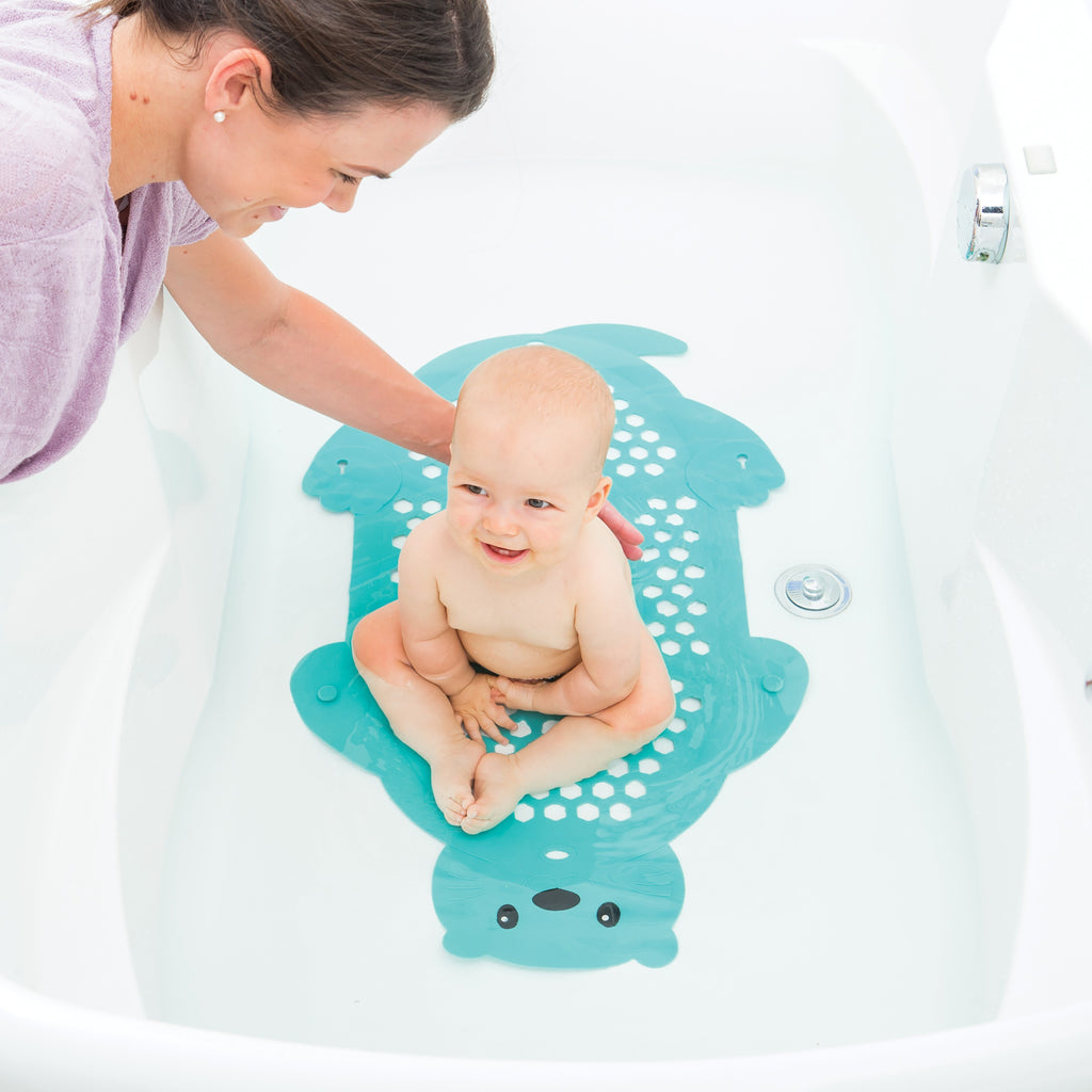 Babies and toddlers will go gaga for this multi-functional bath mat that helps keep little ones from slip-sliding in the tub. The mat is soft and comfortable for little bathers. Plus, the secure suction cup base prevents mat from floating and keeps it securely in place. When playtime is done, fold up the bath mat to create a storage basket for drip-drying bath toys and keeping your tub tidy! Hangs neatly on the included storage hook. Features adorable otter character.