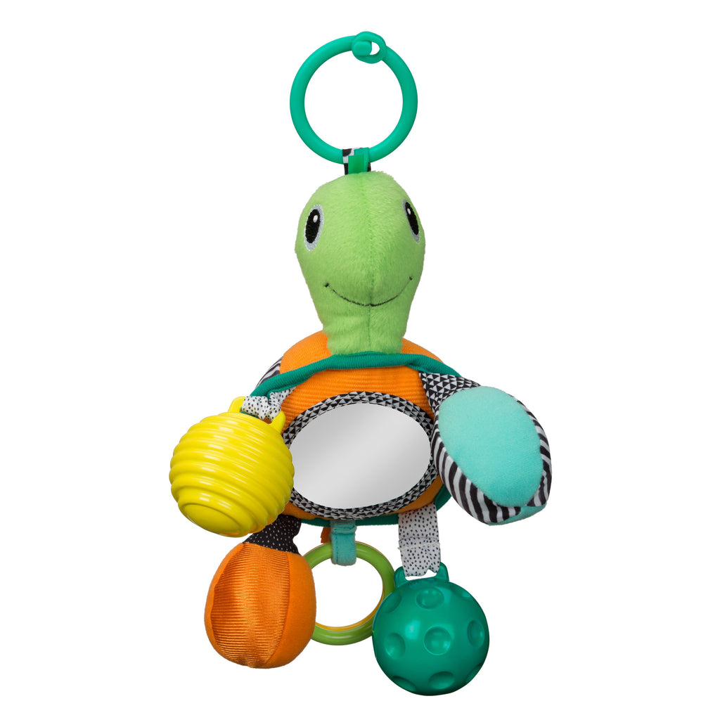 This linkable pal encourages reaching, grabbing, batting and lots of grins. His mirrored belly is perfect for peek-a-boo play! And, shake him to hear a fun rattling sound. Features two rattle feet and two textured sensory ball feet. Links to car seats, strollers, activity gyms and more. Attach the link to the turtle's back or head to give little one a different view of the rattling feet and mirror.